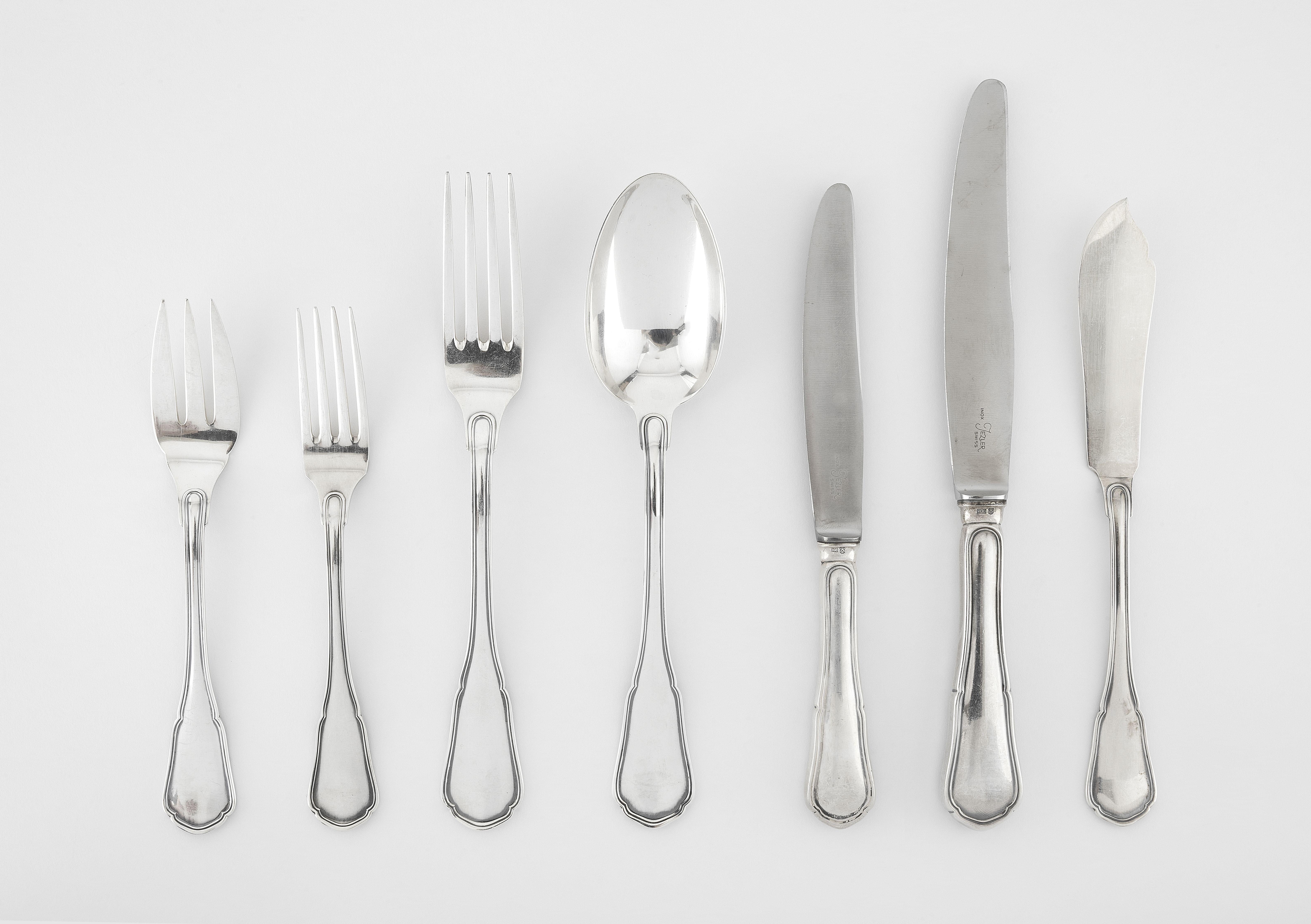 Jezler, argent 800, comprenant: 12 fourchettes, 10 couteaux et 8 cuillères à dîner, 12 fourchettes, 10 couteaux et 12 cuillères à entremets, 6 fourchettes et 6 couteaux à poisson, 6 cuillères à thé et 6 à café, 3400 g (88 p)