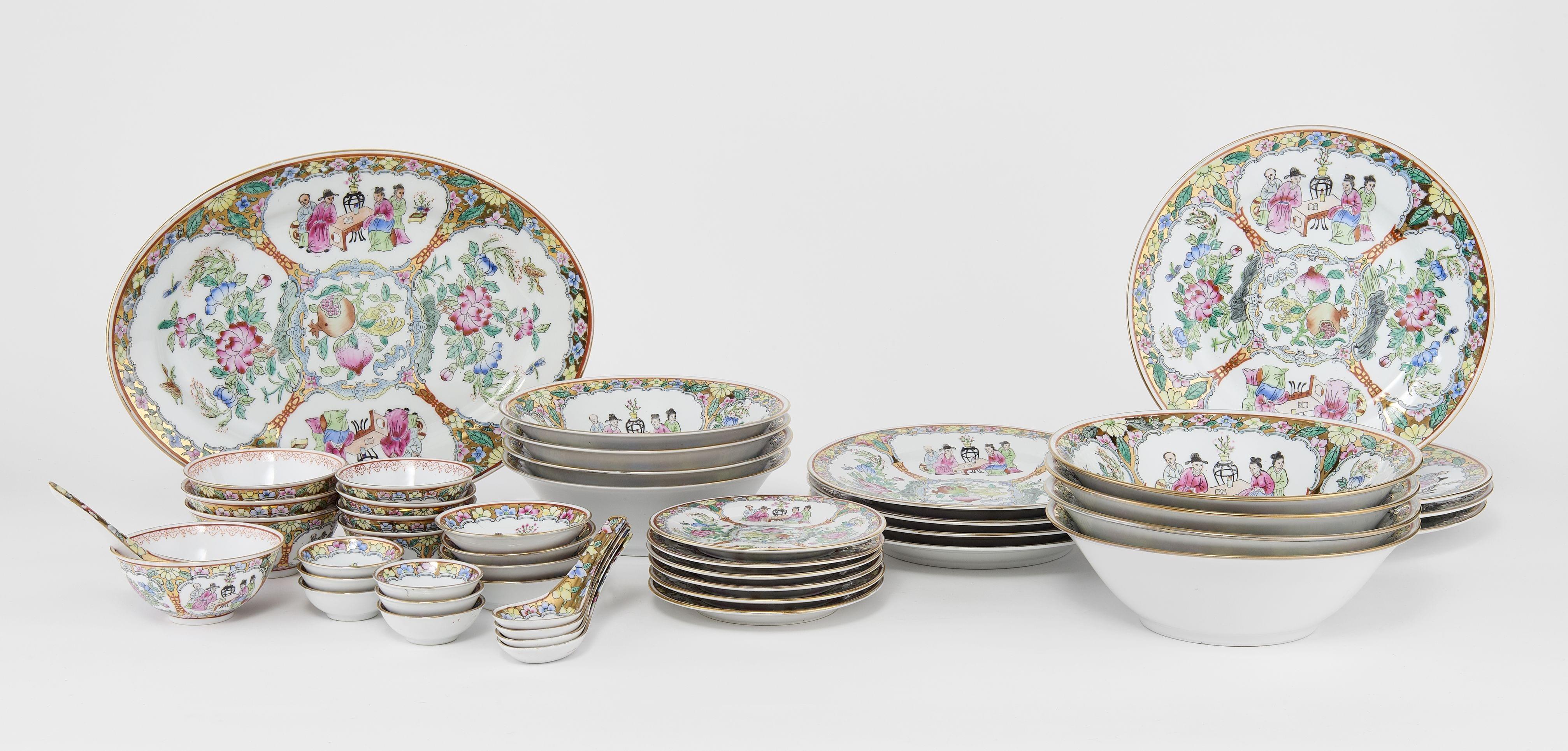 Chine, XXe s, porcelaine, comprenant: deux séries de 12 bols, 12 cuillères, 12 petites assiettes, 20 pièces de service (56p)