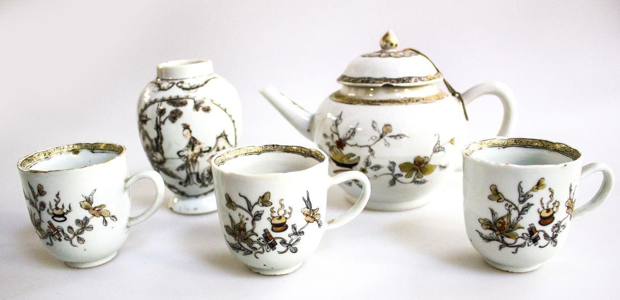 Porcelaine à décor en camaïeu gris et or, Chine, Compagnie des Indes, XVIIIe s. On joint un vase du même modèle