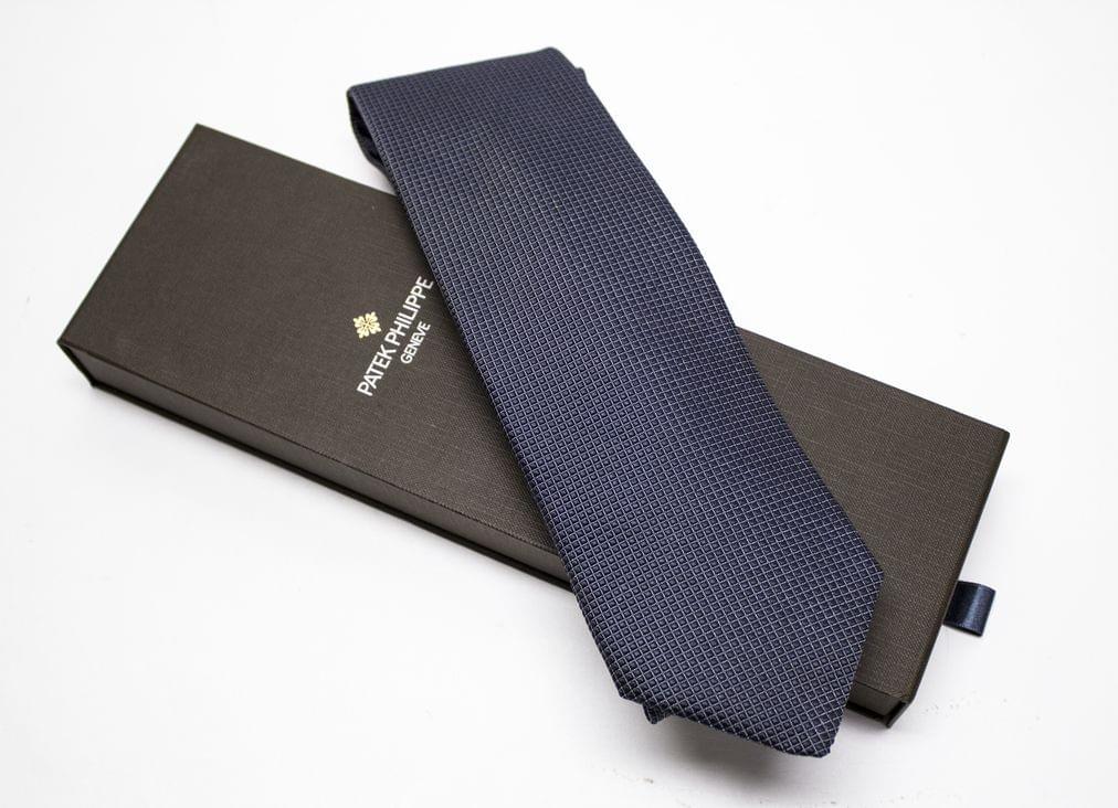Cravate en soie à décor géométrique sur fond bleu marine, dans sa boîte