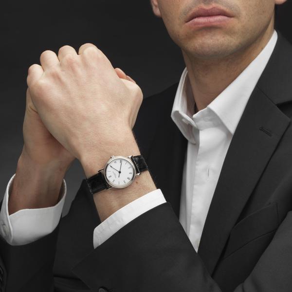 Cadran blanc, aiguilles et chiffres romains noirs, date à guichet à 3h, réf. 3802, or gris 750, D 33 mm, poids brut 45 g