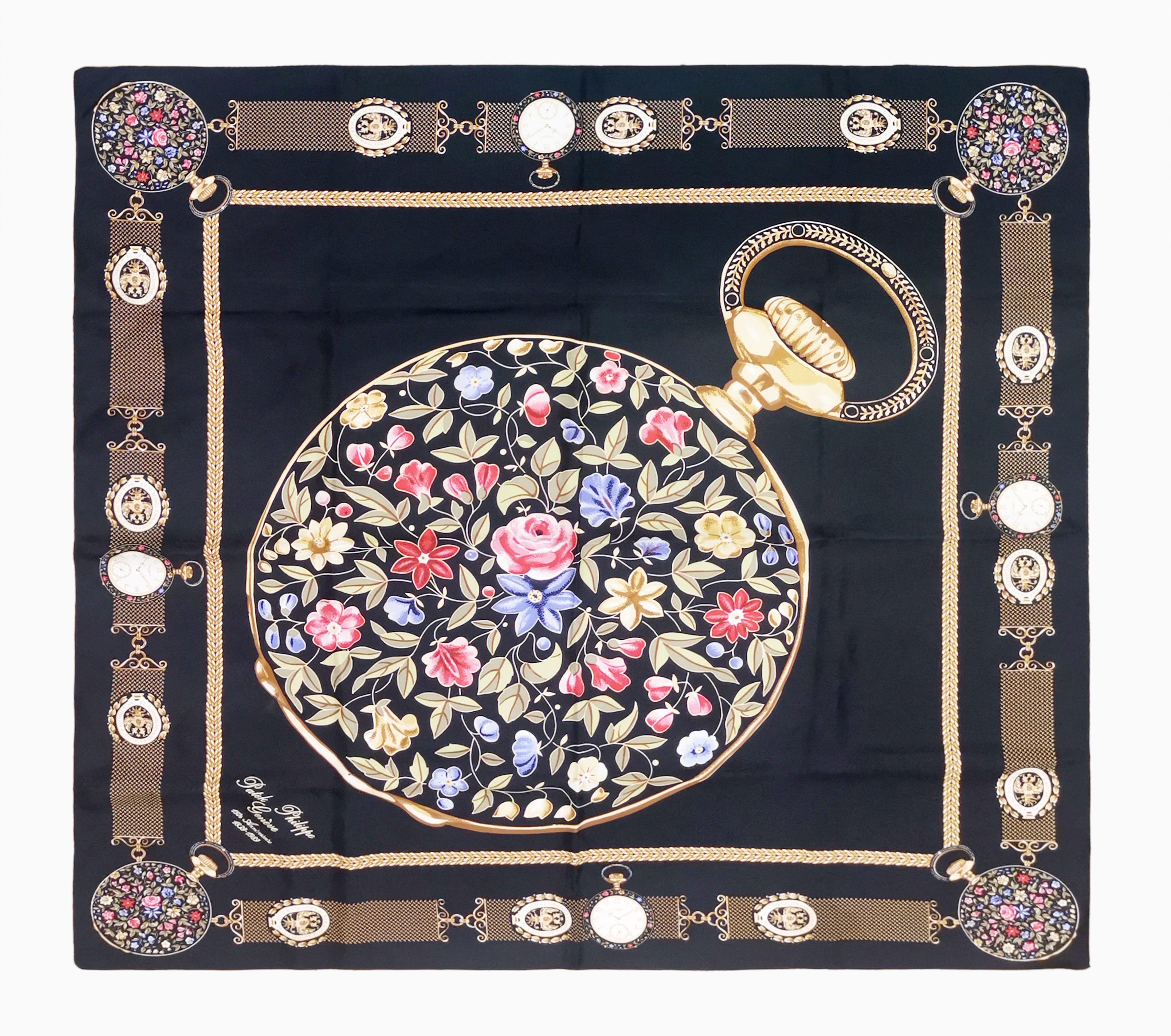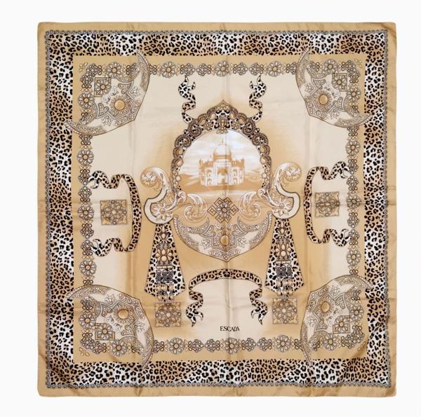 Le premier à décor du Taj Mahal et ornement léopard sur fond camel et le deuxième, à décor de montres à gousset sur fond noir et doré, soie, 88x88 cm