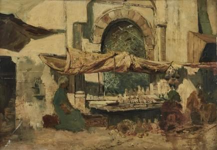 Scène de marché, huile sur carton, signée, 25x36 cm