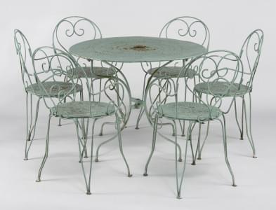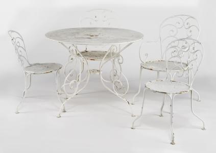 710. Table ronde, deux fauteuils et deux chaises de jardin