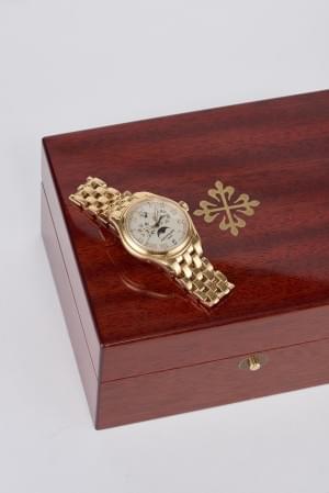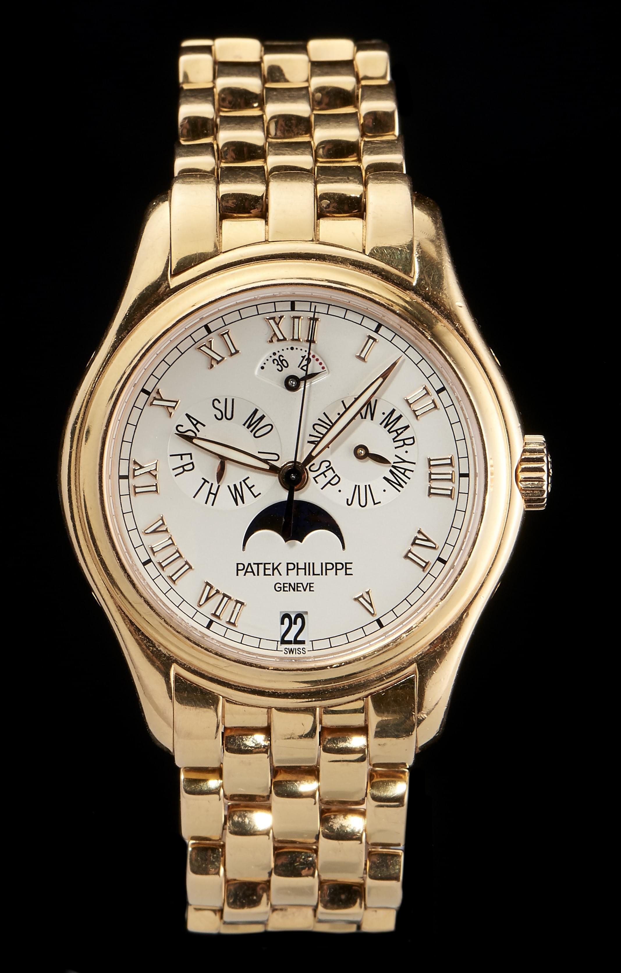 Cadran crème, chiffres romains et aiguilles dorés et luminescents, phases de la Lune, date, jour et mois, réserve de marche, fonds transparent, réf. 5036/1R, or rose 750, D 37 mm, poids brut 153 g, avec certificat d'origine