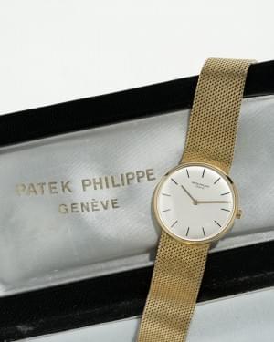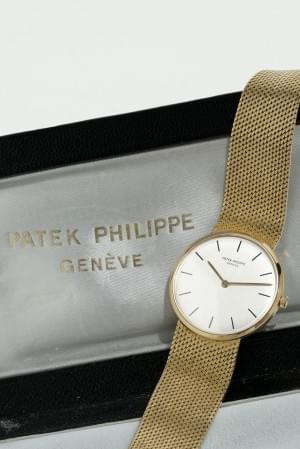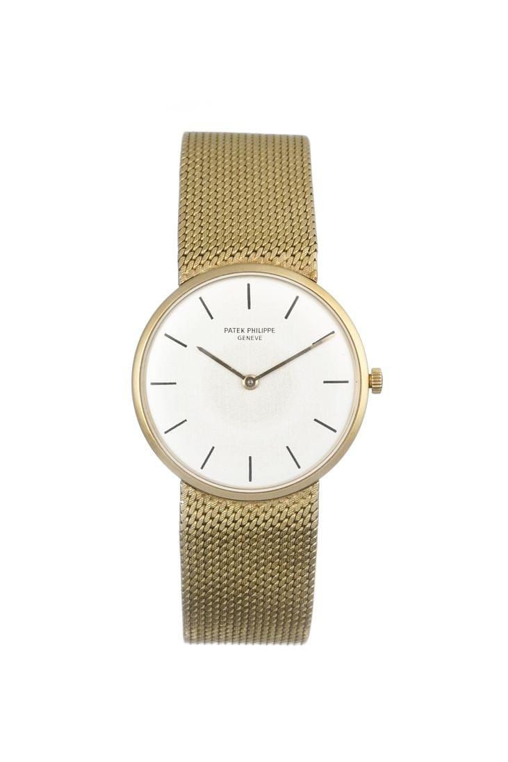Cadran gris, aiguilles dorées, index bâton noir, or 750, D 28 mm, L 18 cm, poids brut 63 g, avec son certificat et son écrin