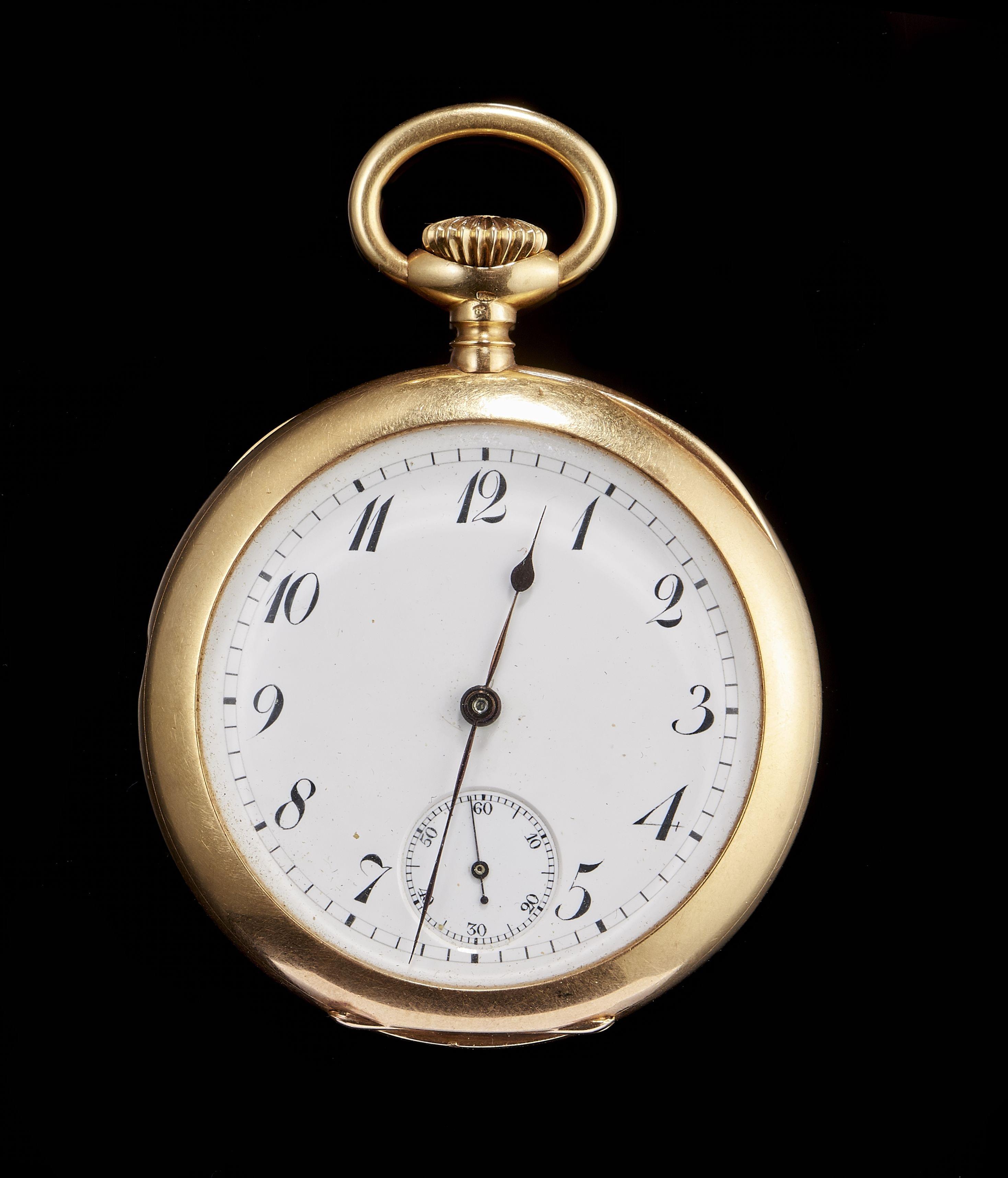 Cadran émaillé blanc, aiguilles noires, chiffres arabes noirs, secondes à 6h, mouvement et boîtier signés, ref. 110.563, 1898, le couvercle intérieur porte l'inscription "A.H. Rodanet, constructeur de chronomètres, Paris", or 750, D 45 mm, poids brut 70 g, avec son extrait des registres