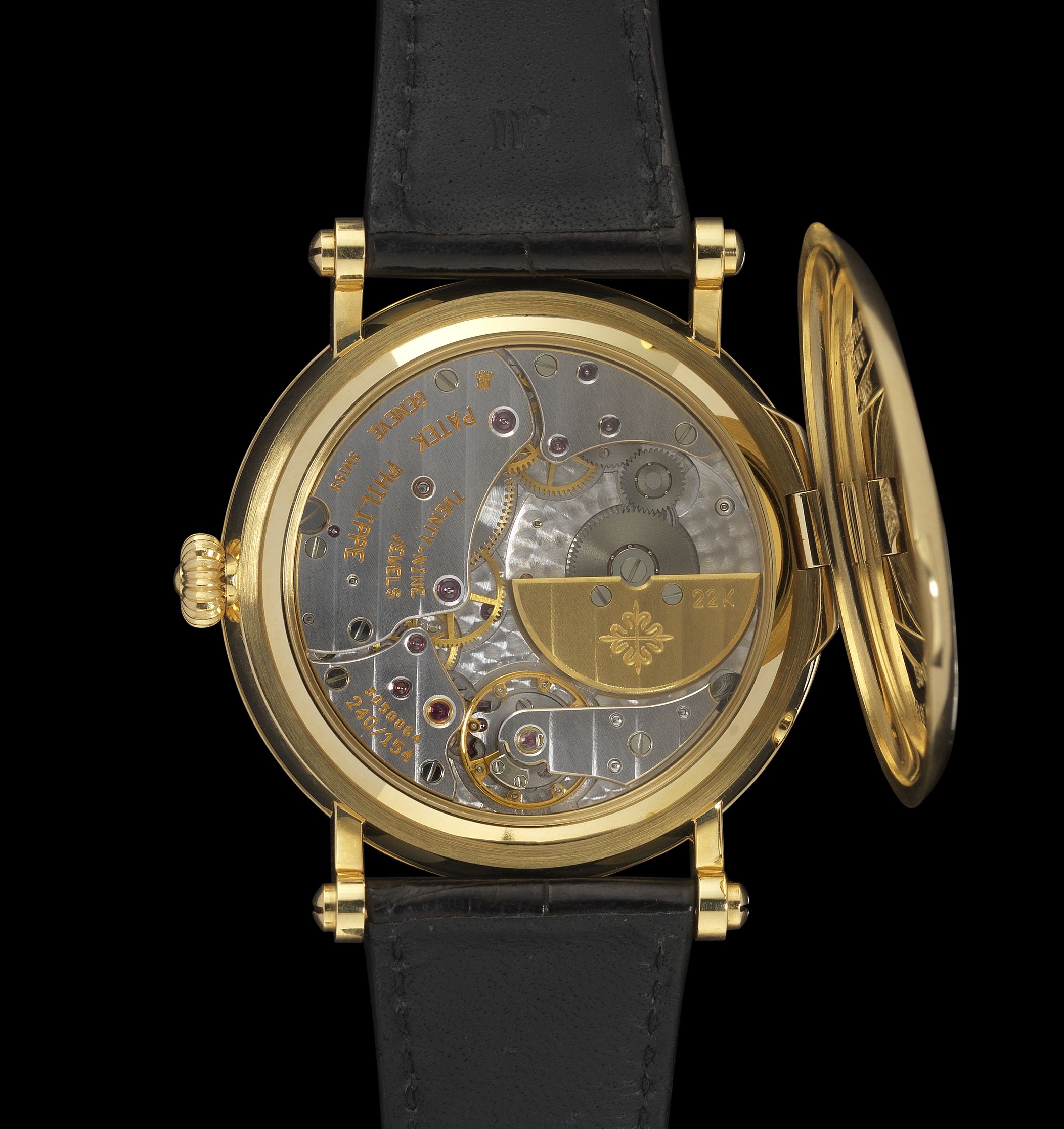 Cadran blanc, aiguilles et chiffres arabes noirs, réserve de marche entre 10 et 11h, phases de Lune à 7h, secondes entre 4h et 5h, ref. 5015, or 750, D 34 mm, poids brut 67 g, accompagnée de son certificat d'origine daté de 1995. Provenance : collection René Bittel