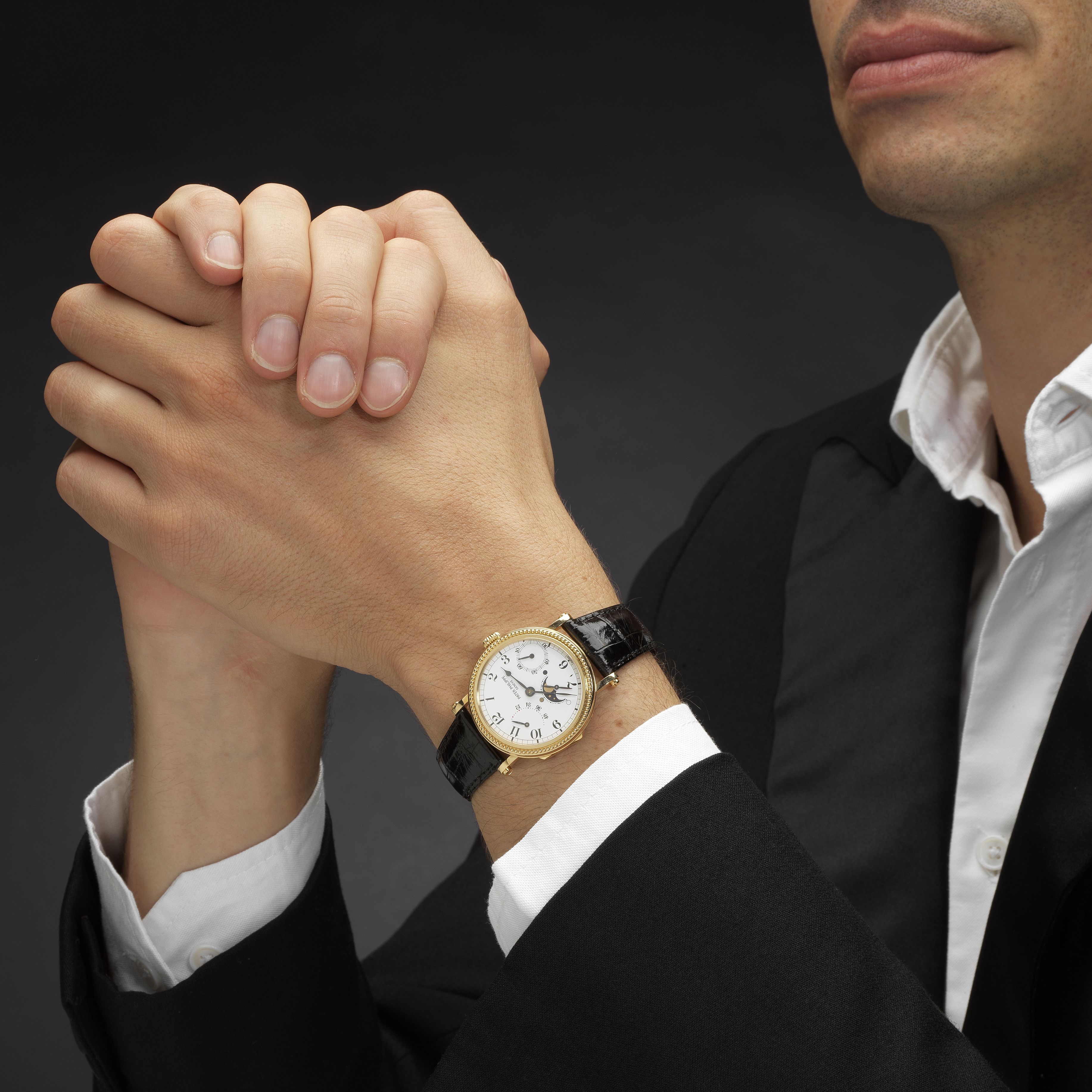 Cadran nacré, aiguilles et chiffres arabes en or rose, index à p...