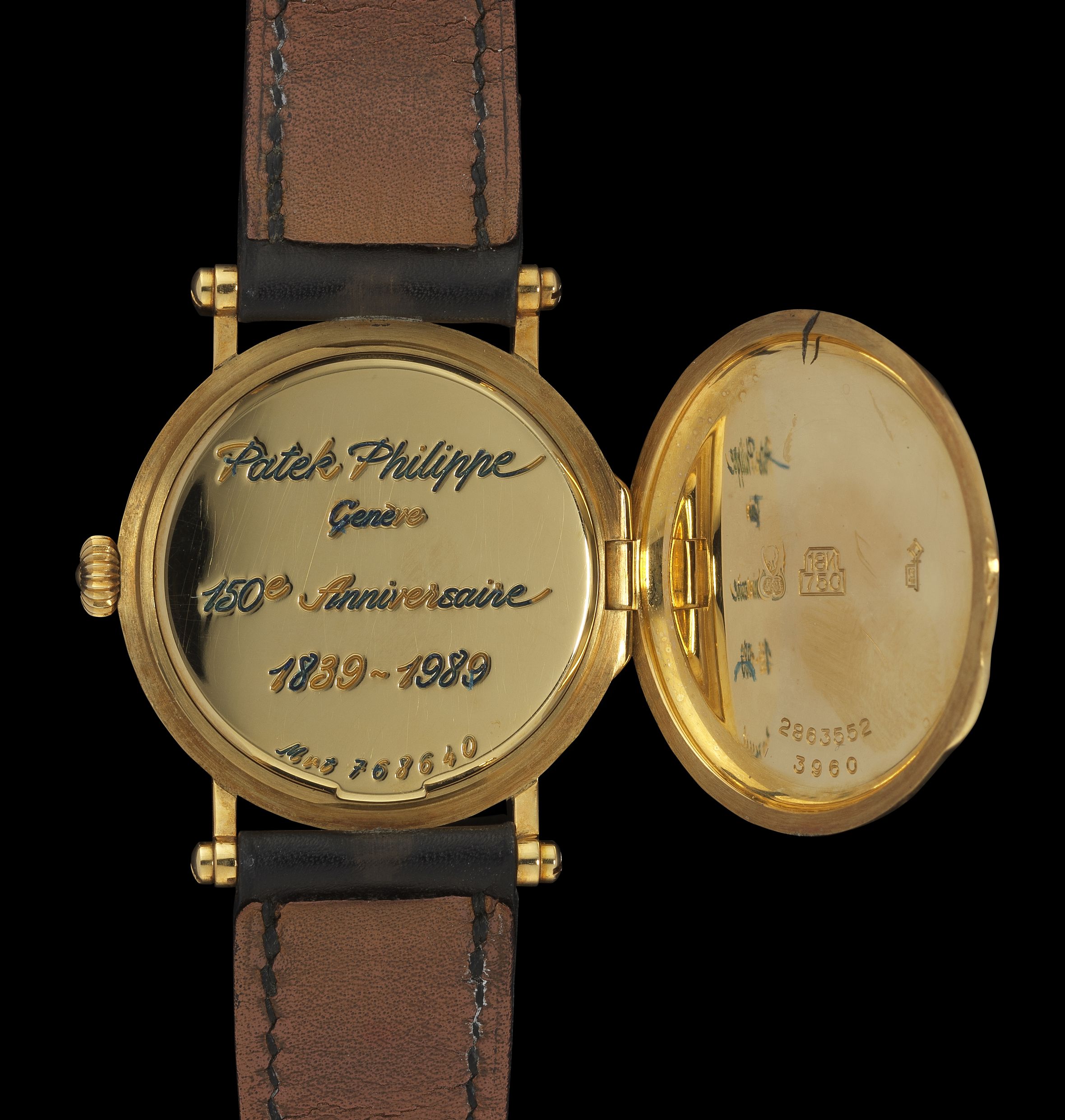 Cadran blanc, aiguilles et chiffres arabes noirs, secondes à 6h, édition limitée à 2000 exemplaires, ref. 3960, or 750, D 33 mm, poids brut 58 g, accompagnée de son attestation Patek Philippe datée de 1989 et d'une médaille commémorative du 150e anniversaire de la manufacture Patek Philippe. Provenance : collection René Bittel
