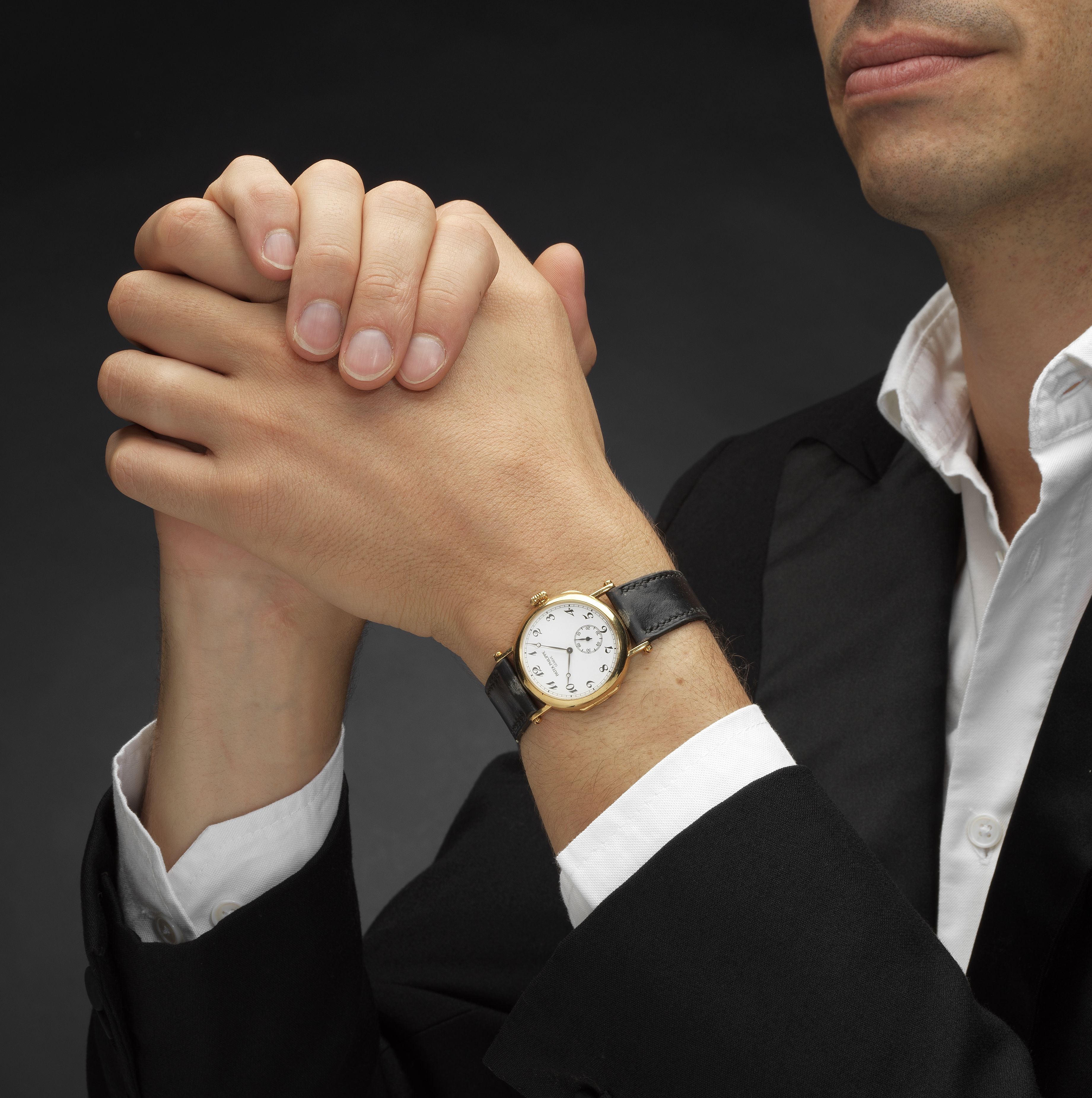 Cadran crème, aiguilles bleuies, chiffres romains noirs, or gris...