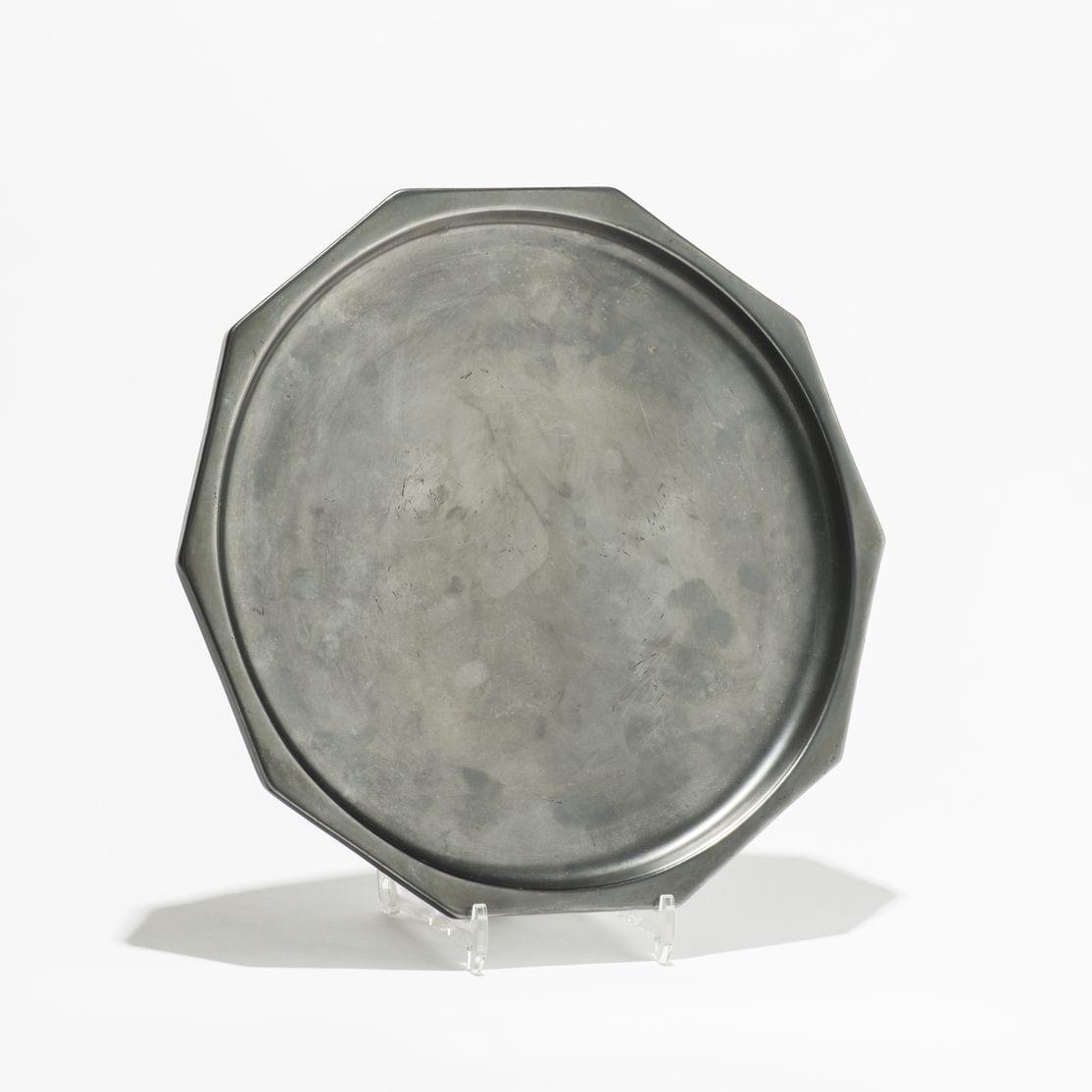 Grand plat décagonal, céramique lustrée noire, signé, D 36 cm