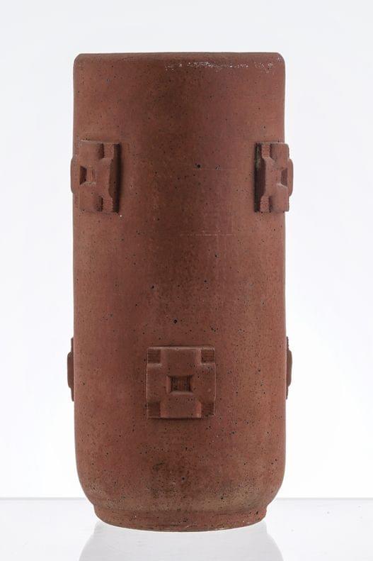 Grand vase cylindrique à décor de plaquettes cruciformes en relief, grès rouge, H 32,3 cm