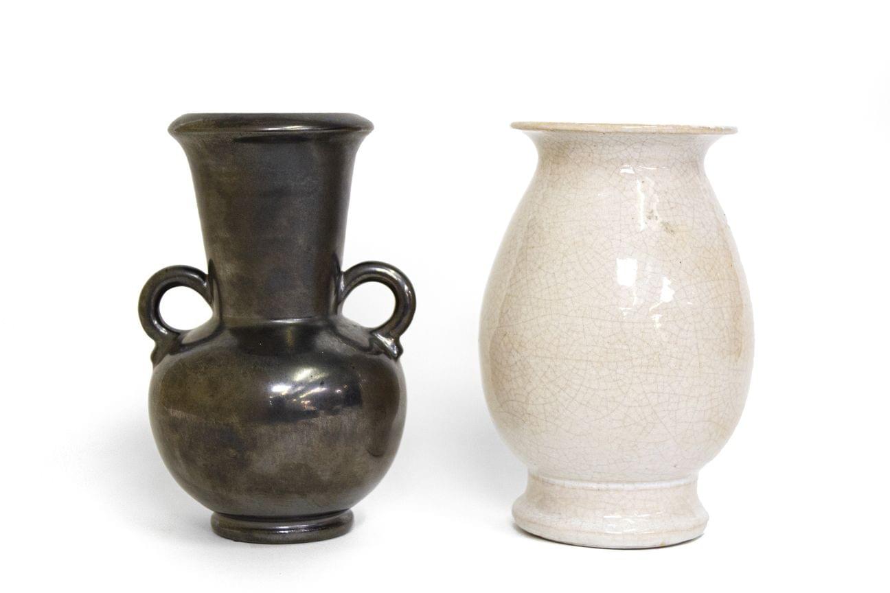 Vase, céramique émaillée ivoire craquelée, signé Bonifas, H 19,5 cm. On joint un vase à anses, céramique lustrée noire, H 19 cm.