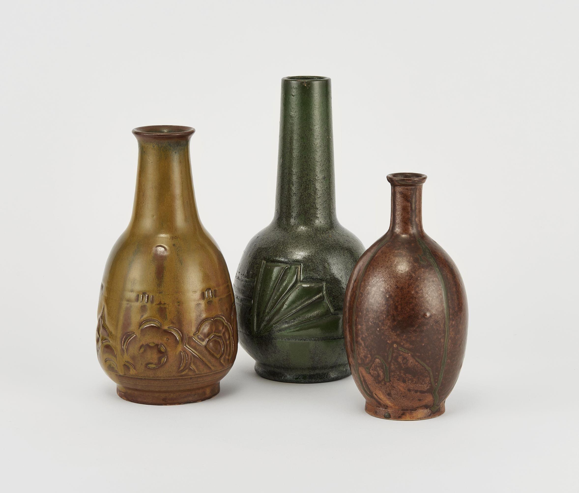 Deux pieds de lampe et un vase, céramique à décor en léger relief émaillée vert, ocre et brun, H 19, 22 et 26 cm