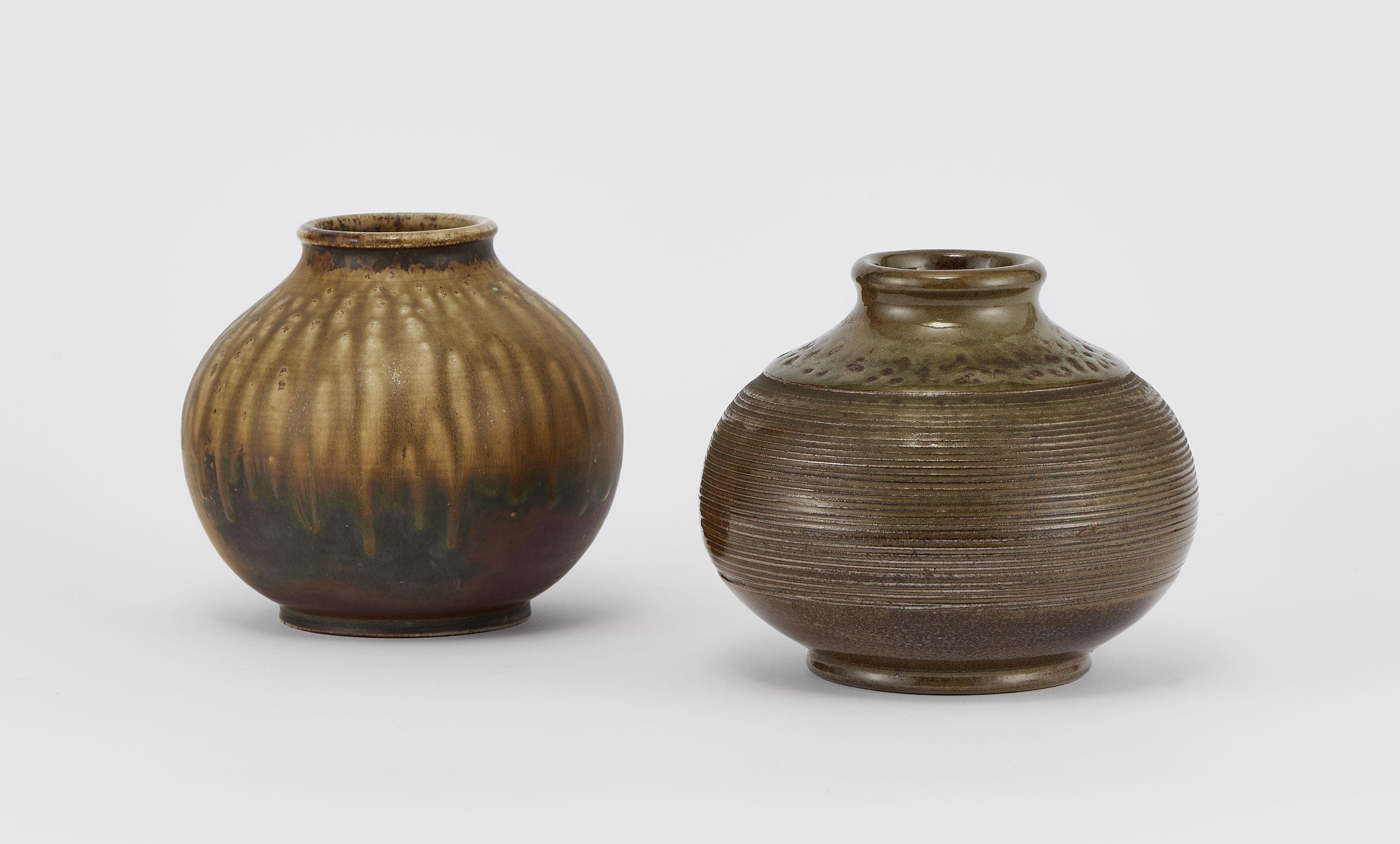 Deux vases pansus, céramique émaillée taupe, H 15,5 et 16 cm