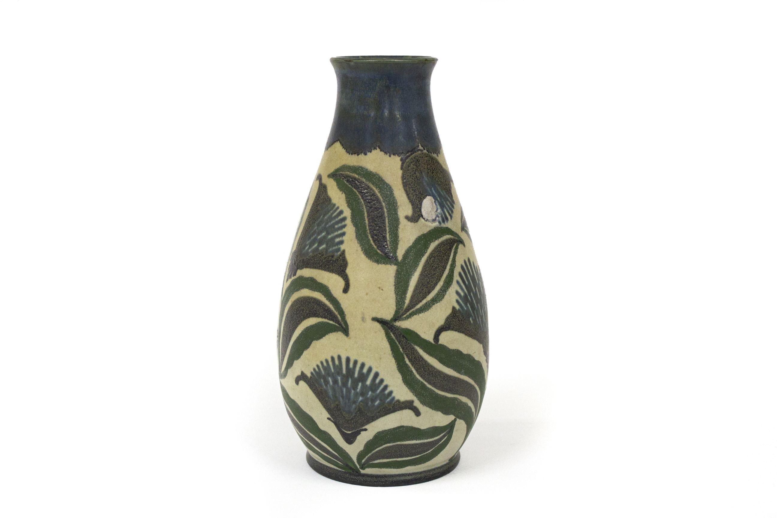 Pied de lampe, céramique émaillée bleu vert et noir sur fond ivoire, signé et daté 1925 sous la base, H 28 cm