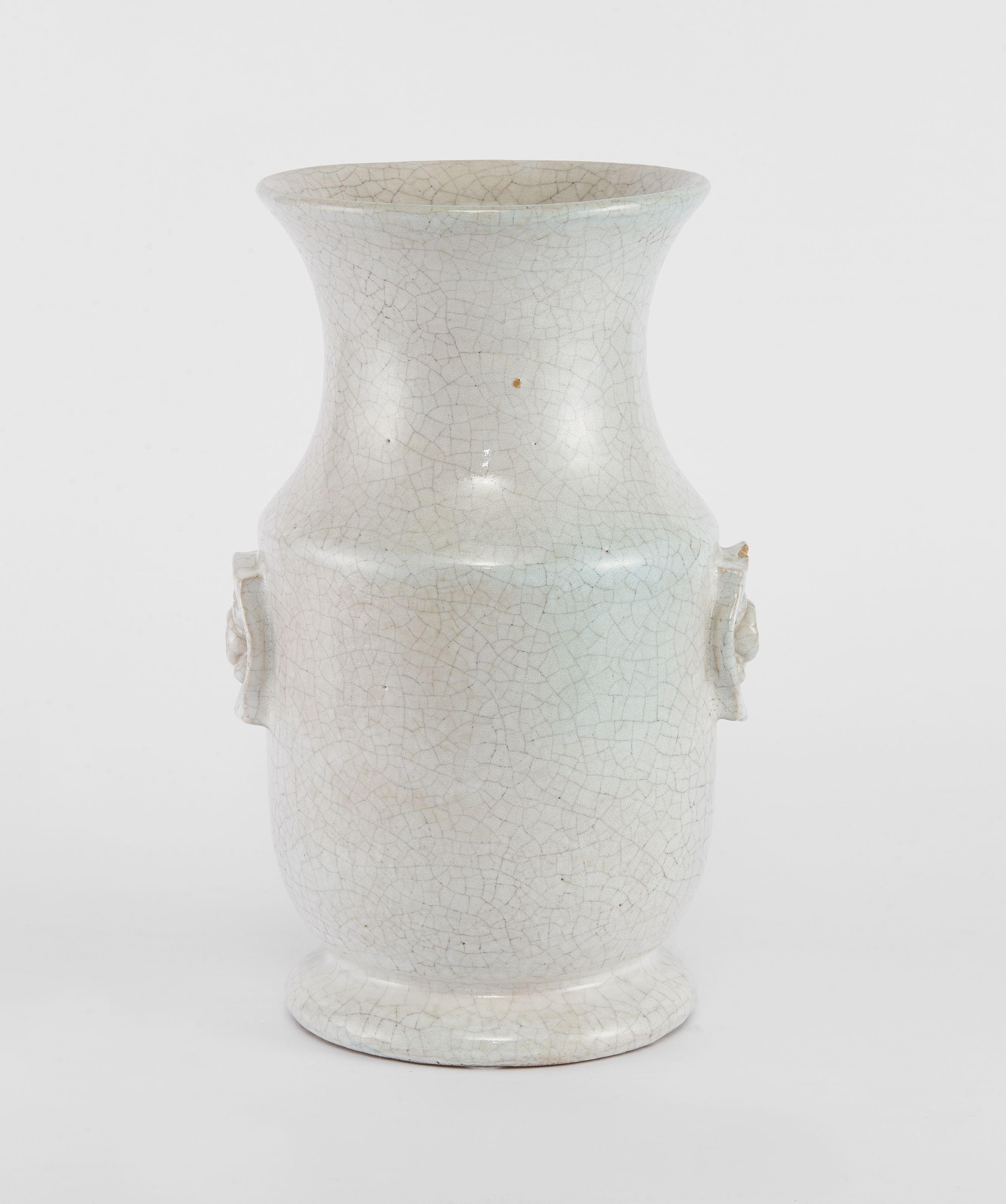 Vase dans le goût japonisant à décor de médaillons latéraux, céramique émaillée ivoire craquelée, gravé en creux Bonifas, H 27 cm
