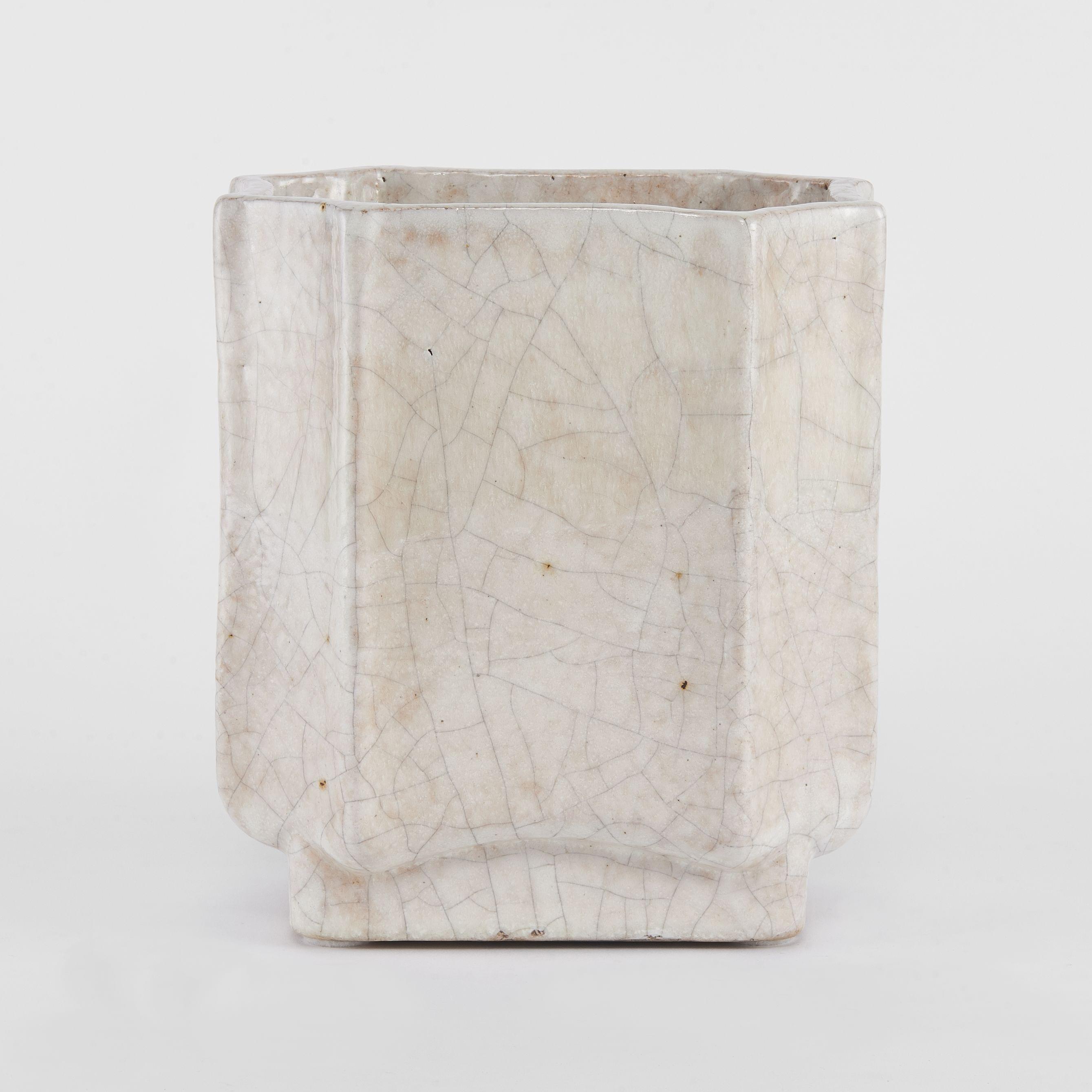 Vase octogonal, céramique émaillée ivoire craquelée, signé Bonifas France, H 21 cm