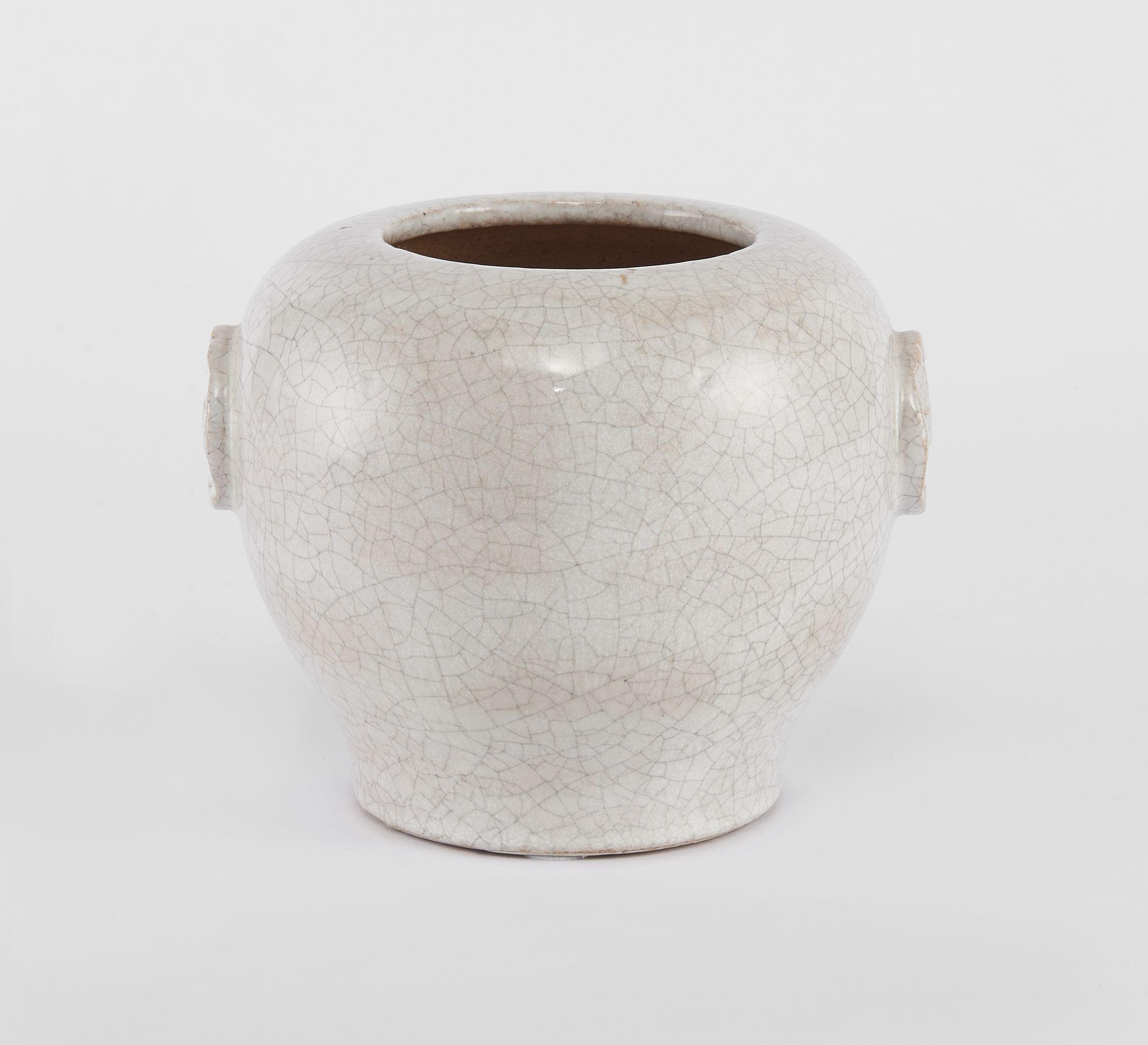 Vase boule à décor de médaillons latéraux, céramique émaillée ivoire craquelée, signé Boas, H 15 cm