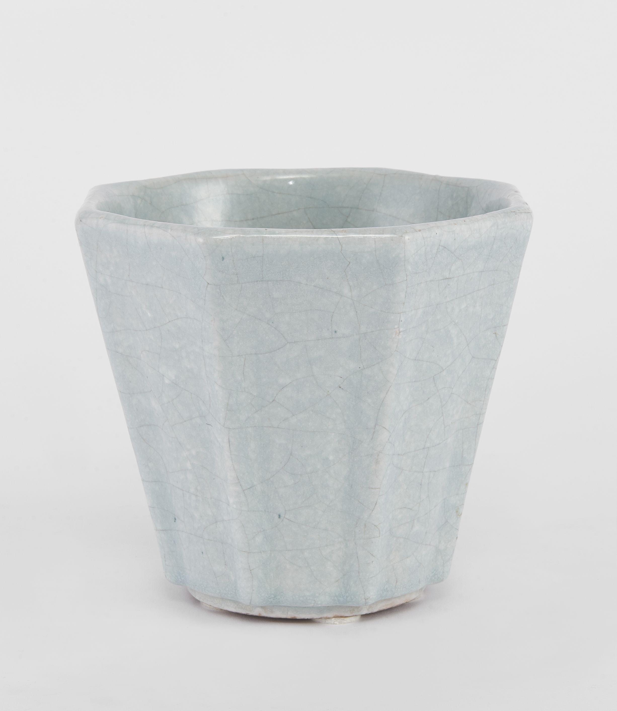 Cache-pot octogonal, céramique émaillée céladon clair craquelée, signé Boas et numéroté 754, H 13 cm