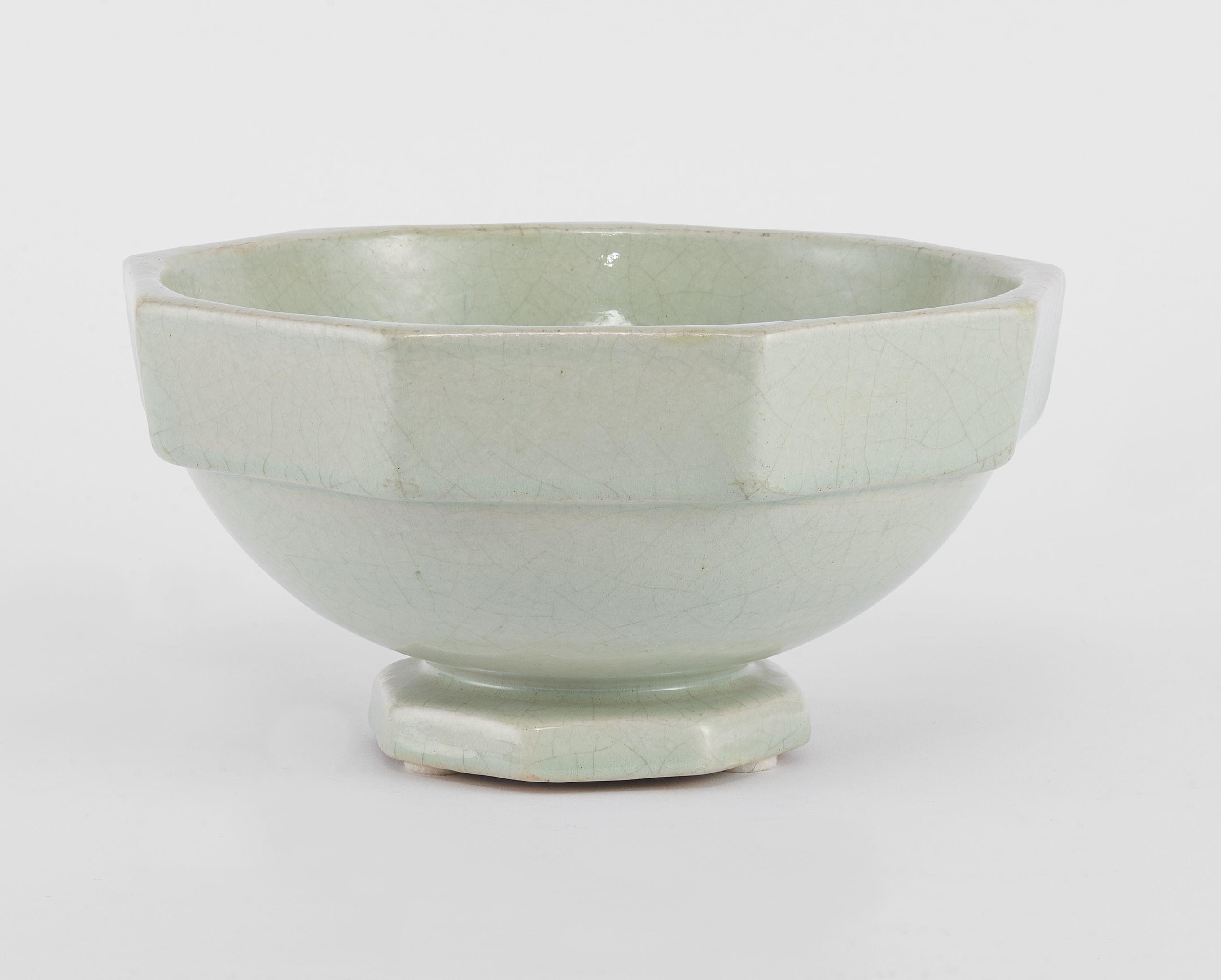 Coupe octogonale sur pied ennéagonal, céramique émaillée céladon clair craquelée, signé Lifas Ferney Voltaire et numéroté 18/125, D 23,5 cm