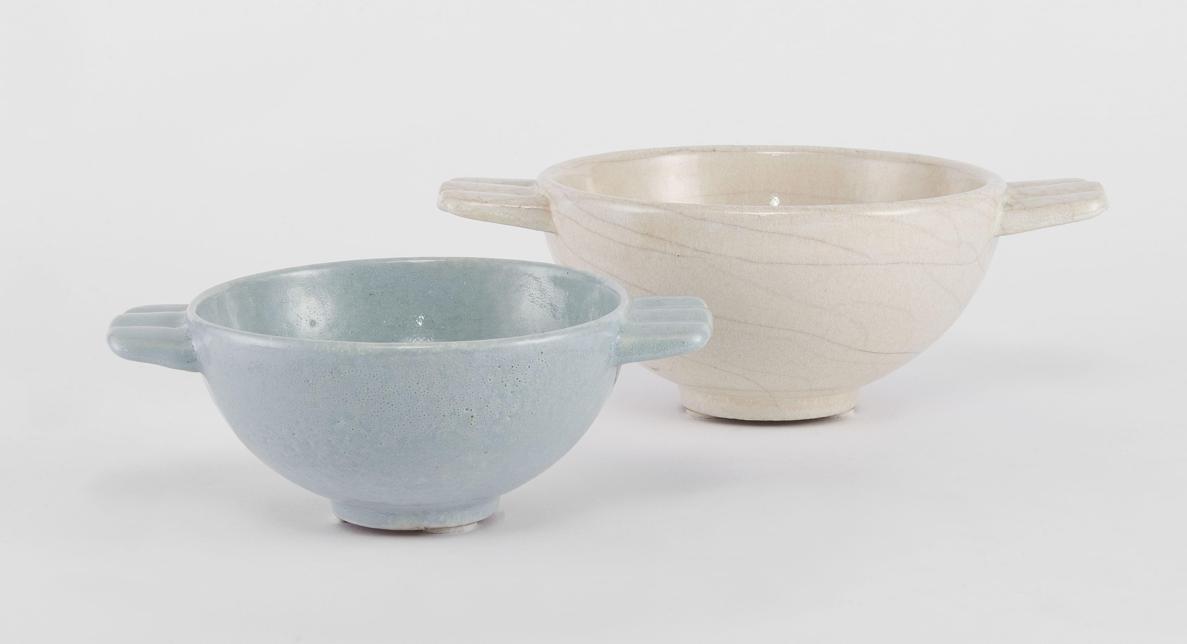 Deux bols à anses latérales, céramique émaillée céladon clair et ivoire craquelée, un signé Bonifas, L 18 et 23 cm