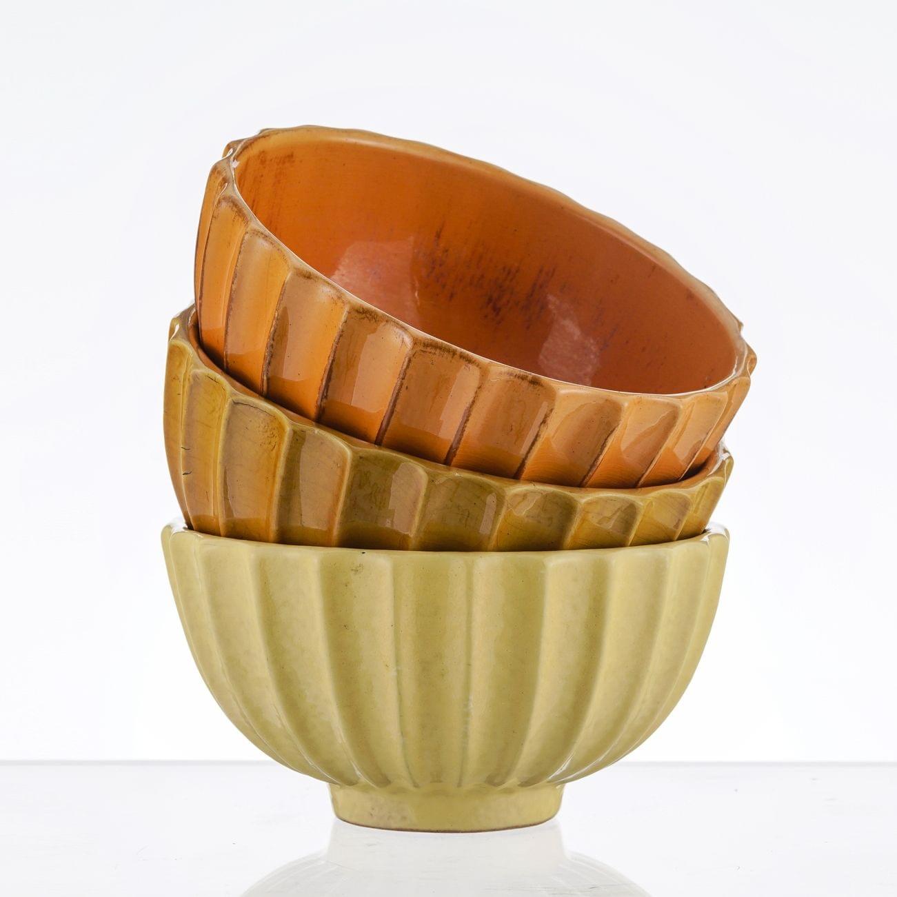 Trois grands bols côtelés, céramique émaillée jaune et orange, signés Boas France et numérotés 290-8, D 20 cm