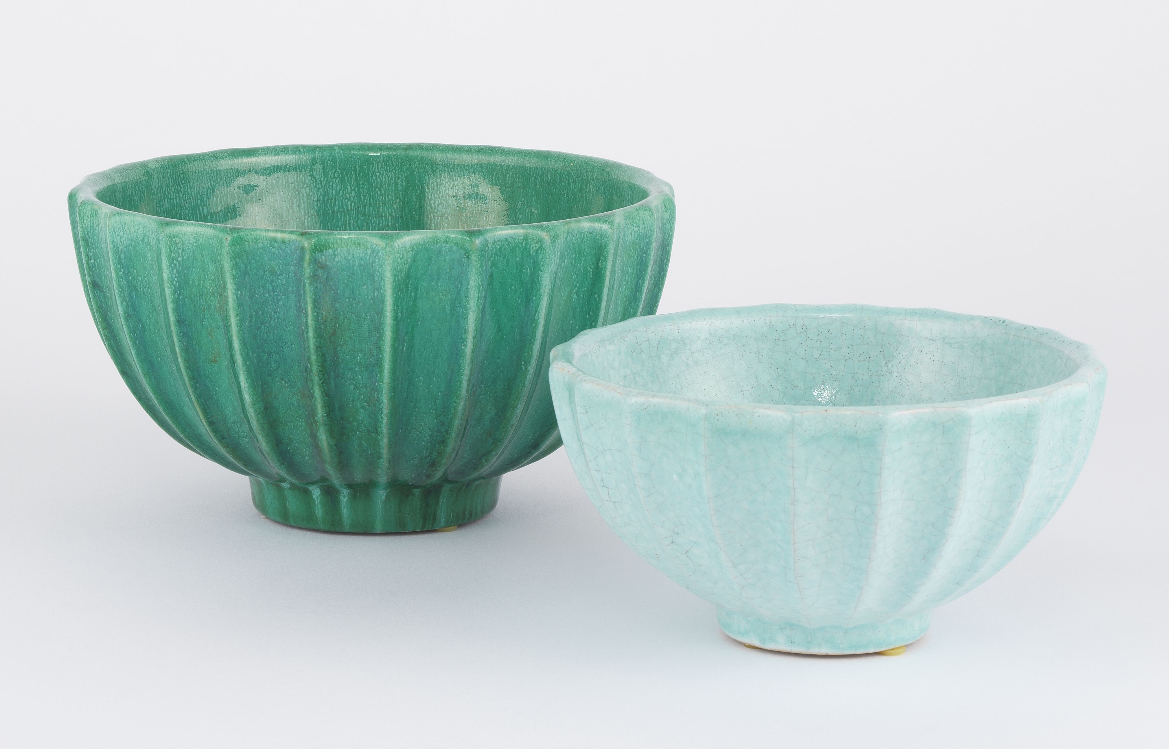 Deux bols cannelés, céramique émaillée vert et bleu claire, sign...