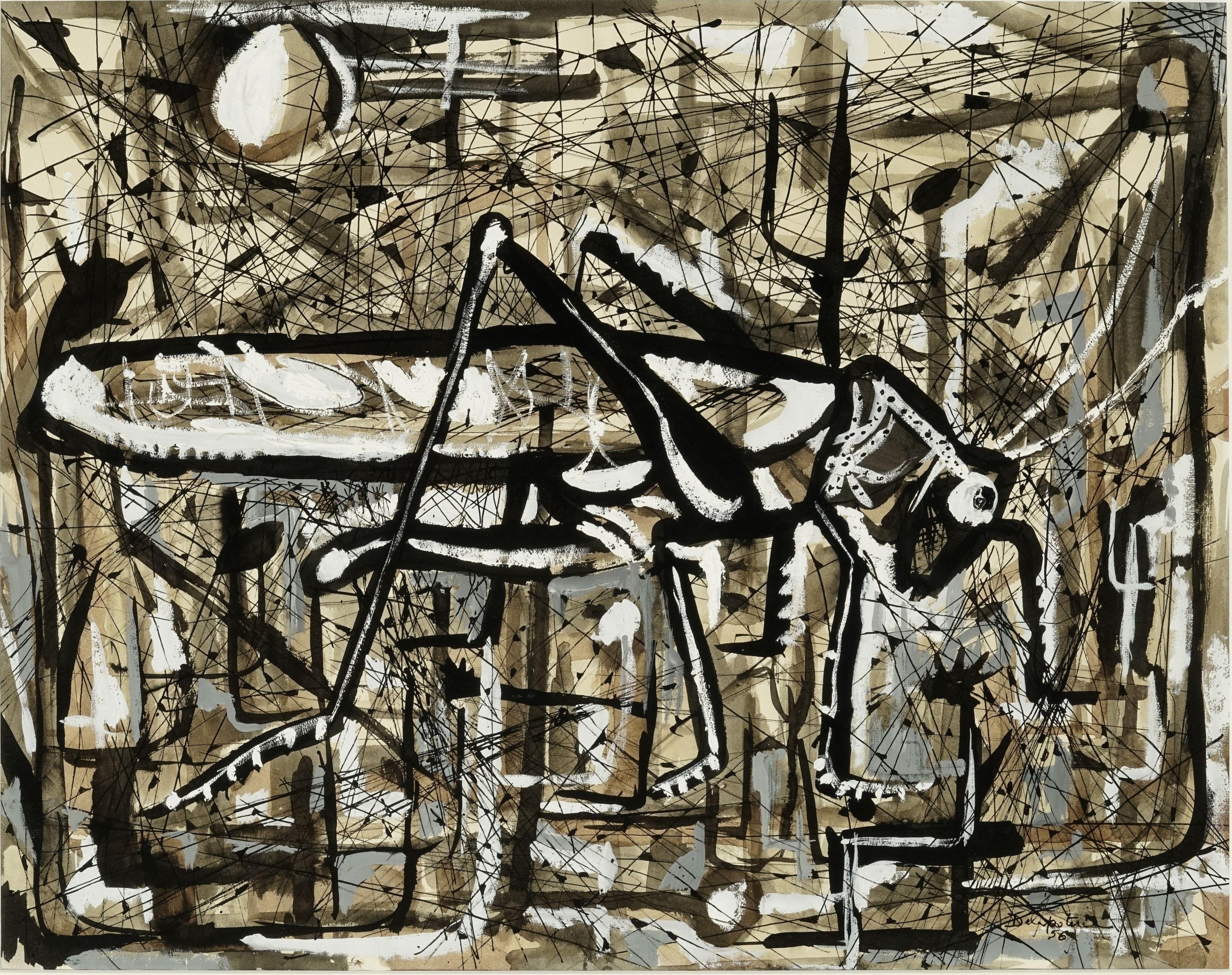 Abstraction, huile sur pavatex, signée et datée 1961, 25,5x81 cm