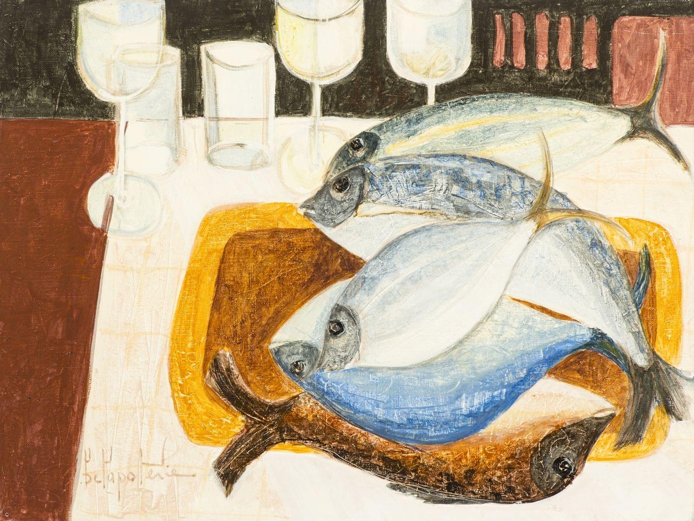 Nature morte aux poissons, huile sur toile, signée, 38x50 cm