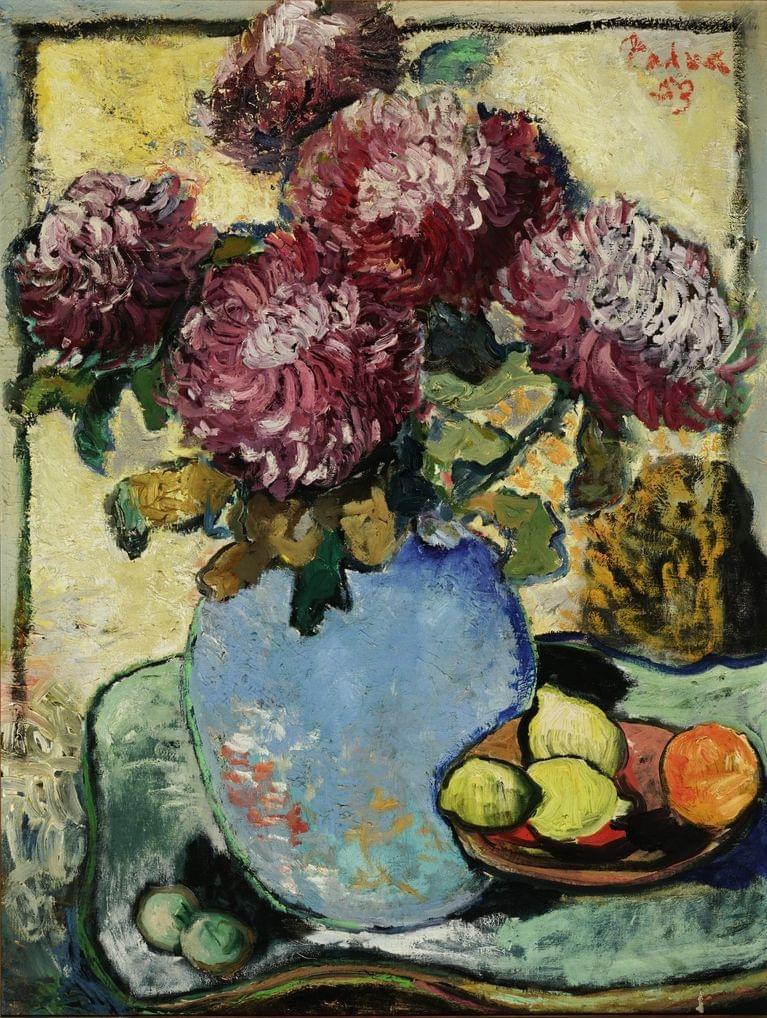 Bouquet de dahlias, huile sur toile, signée et datée 53, 82x62 cm