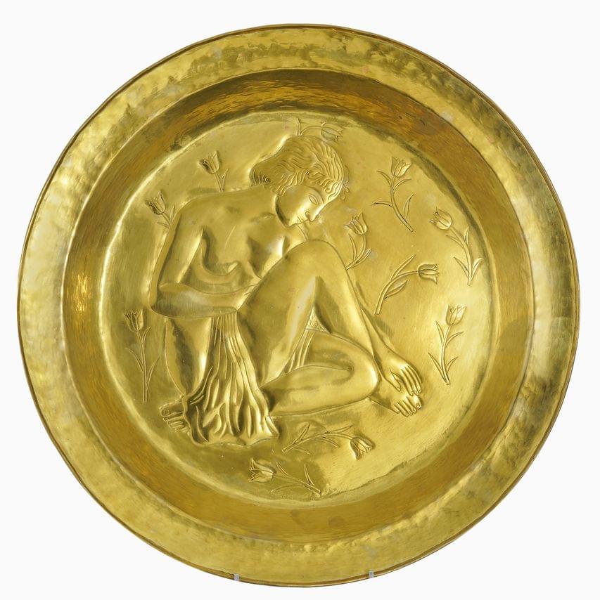 Plat à décor d'une jeune femme au bain dans un semis de fleurs, laiton repoussé, signé et situé Locarno cà di Ferro, circa 1930, D 34,5 cm