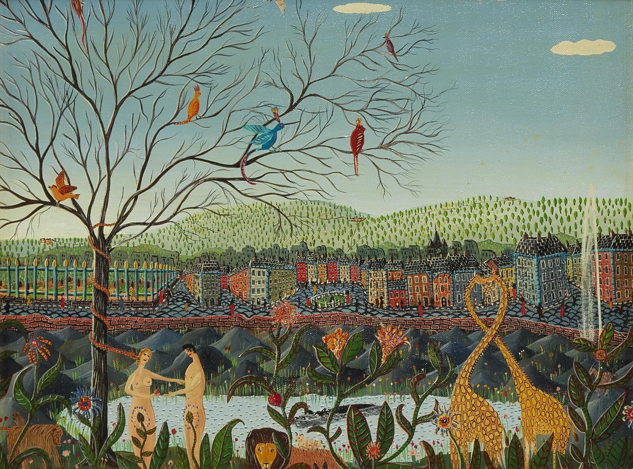 Adam et Eve à Genève, huile sur toile, signée, 33x39 cm