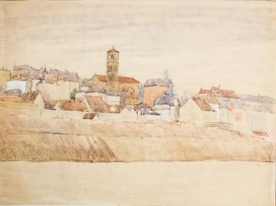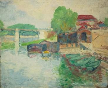 Port fluvial, huile sur toile marouflée sur carton, 32x40 cm. Pr...