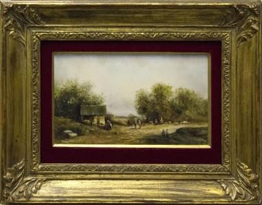Scène au bord d'un chemin, huile sur carton, signée, 22x13 cm