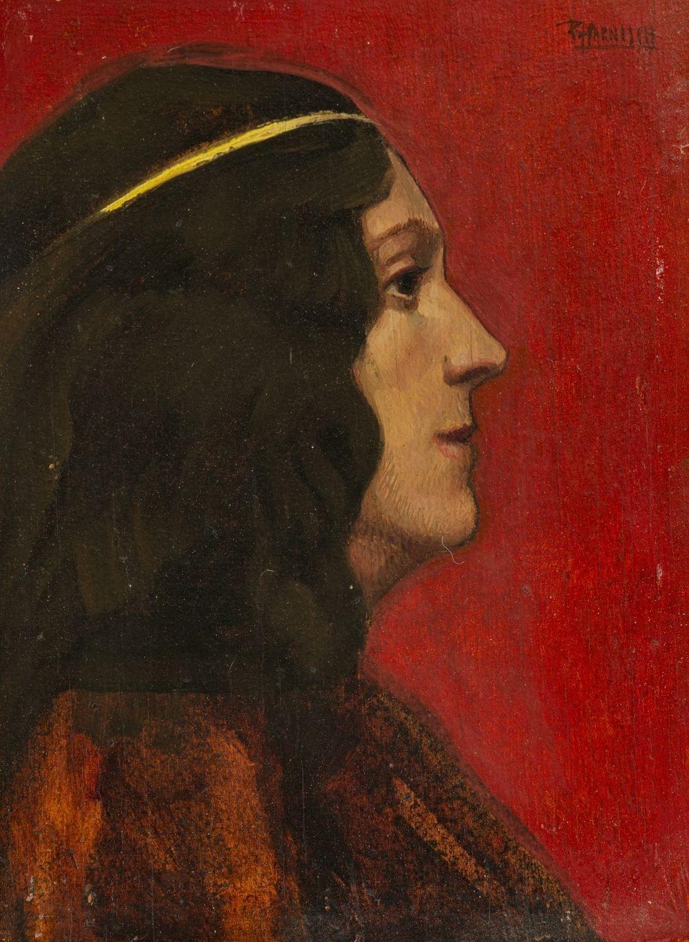 Femme de profil sur fond rouge, huile sur bois, 21,5x14,5 cm