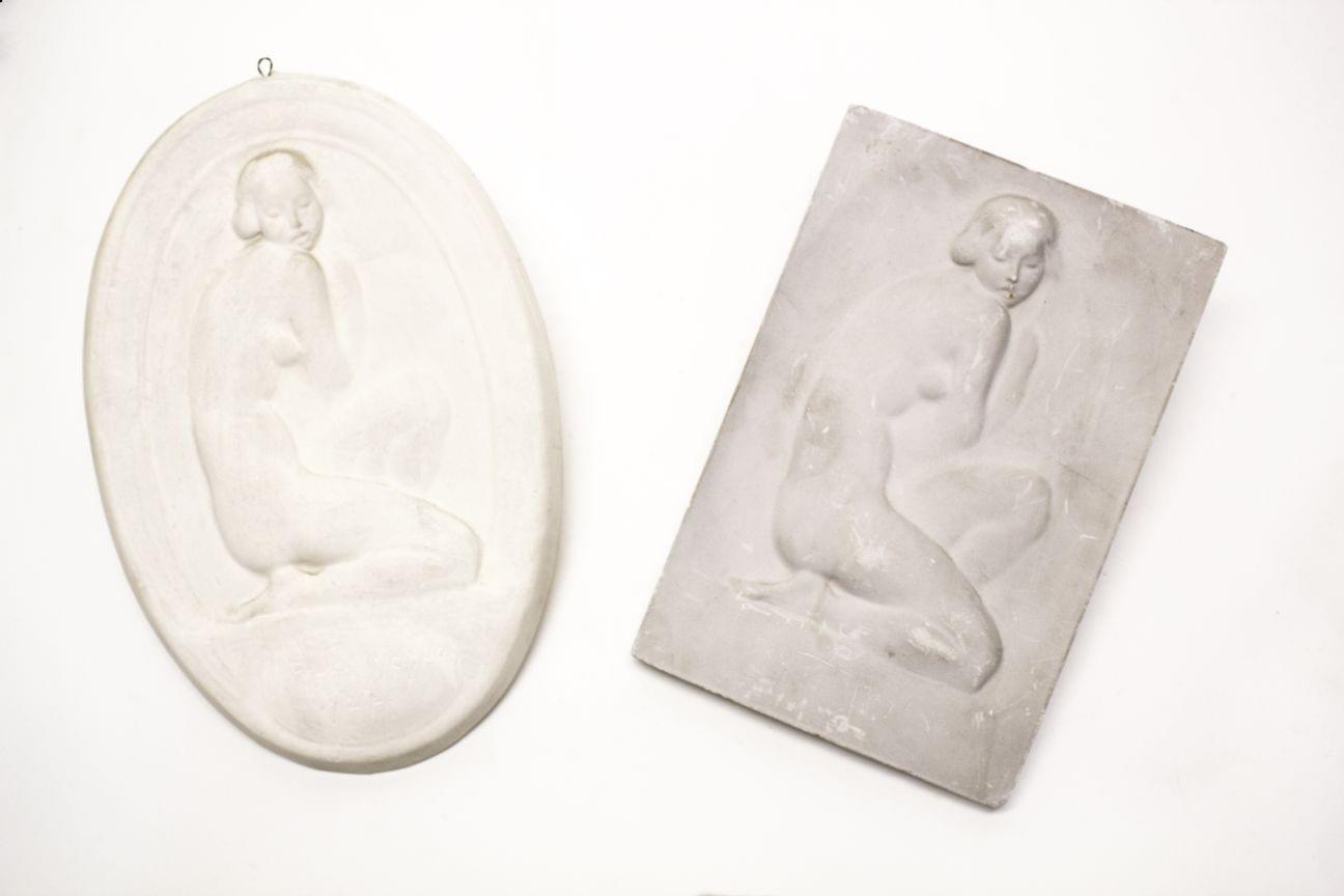 Baigneuse, bas-relief ovale en plâtre. signé et daté 1927, H 29 cm. On joint un moulage similaire rectangulaire, H 24 cm.