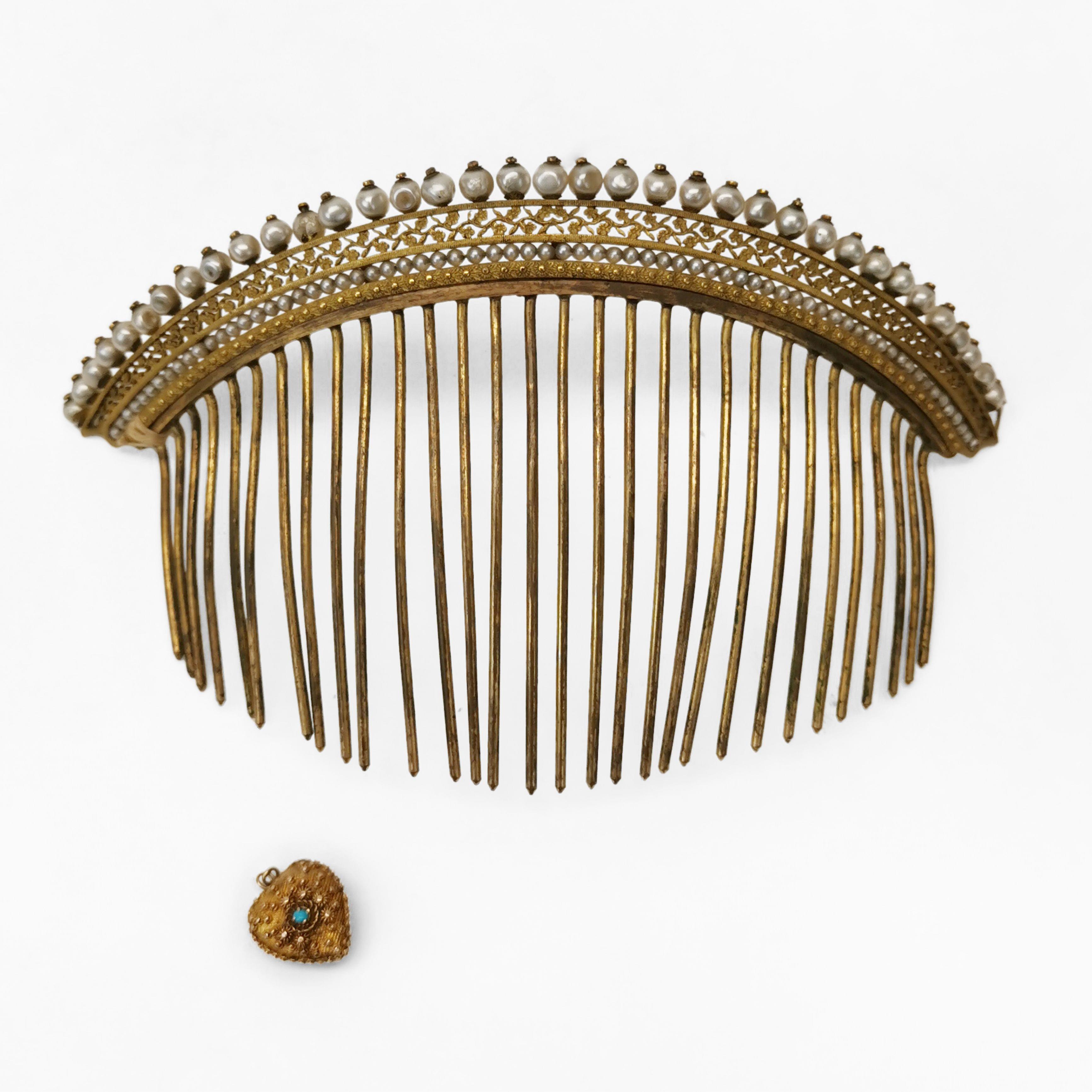 Serti d'une ligne de perles d'imitation, métal doré. On joint un pendentif ouvrant à motif de cœur à décor de granulation et serti d'une turquoise en or 750. Pour les lots précédés d'un *, la TVA de 7,7% est due sur l'entier du prix d'adjudication.