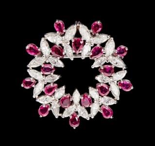 124. Broche ronde ajourée pavée de rubis taille poire (env. 1,8 ct) e...