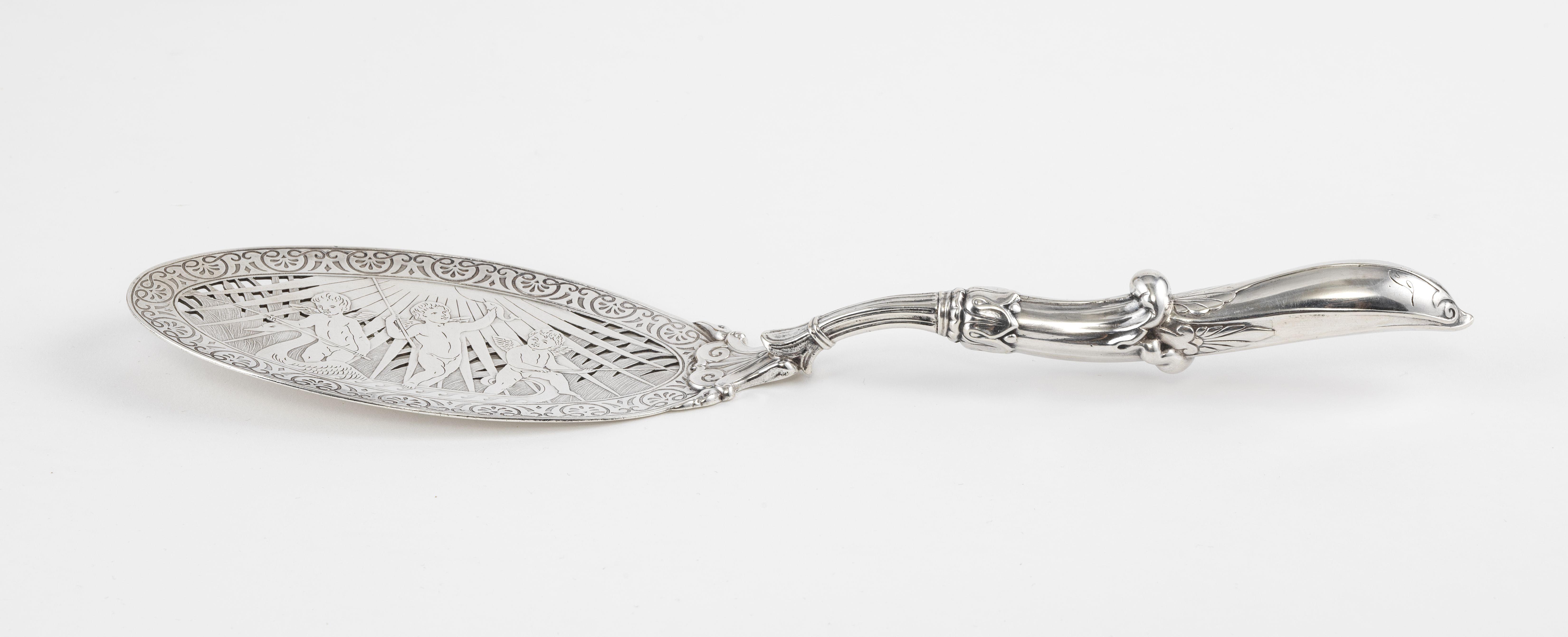 3778. Pelle de service à motif ajouré de trois enfants dans une barque sous les rayons du soleil