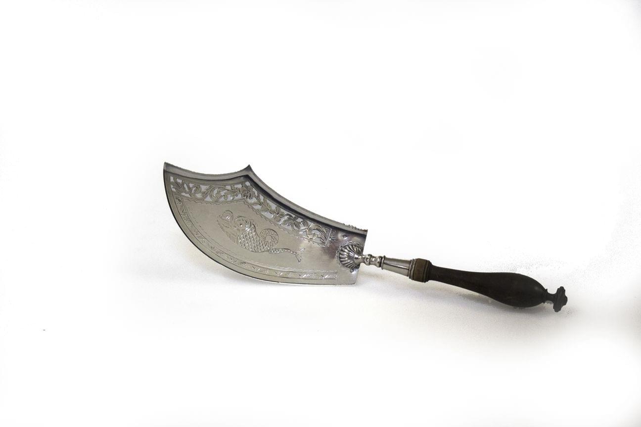 3254. Pelle de service d'époque Restauration à décor gravé de dauphin et ajouré de rinceaux, France