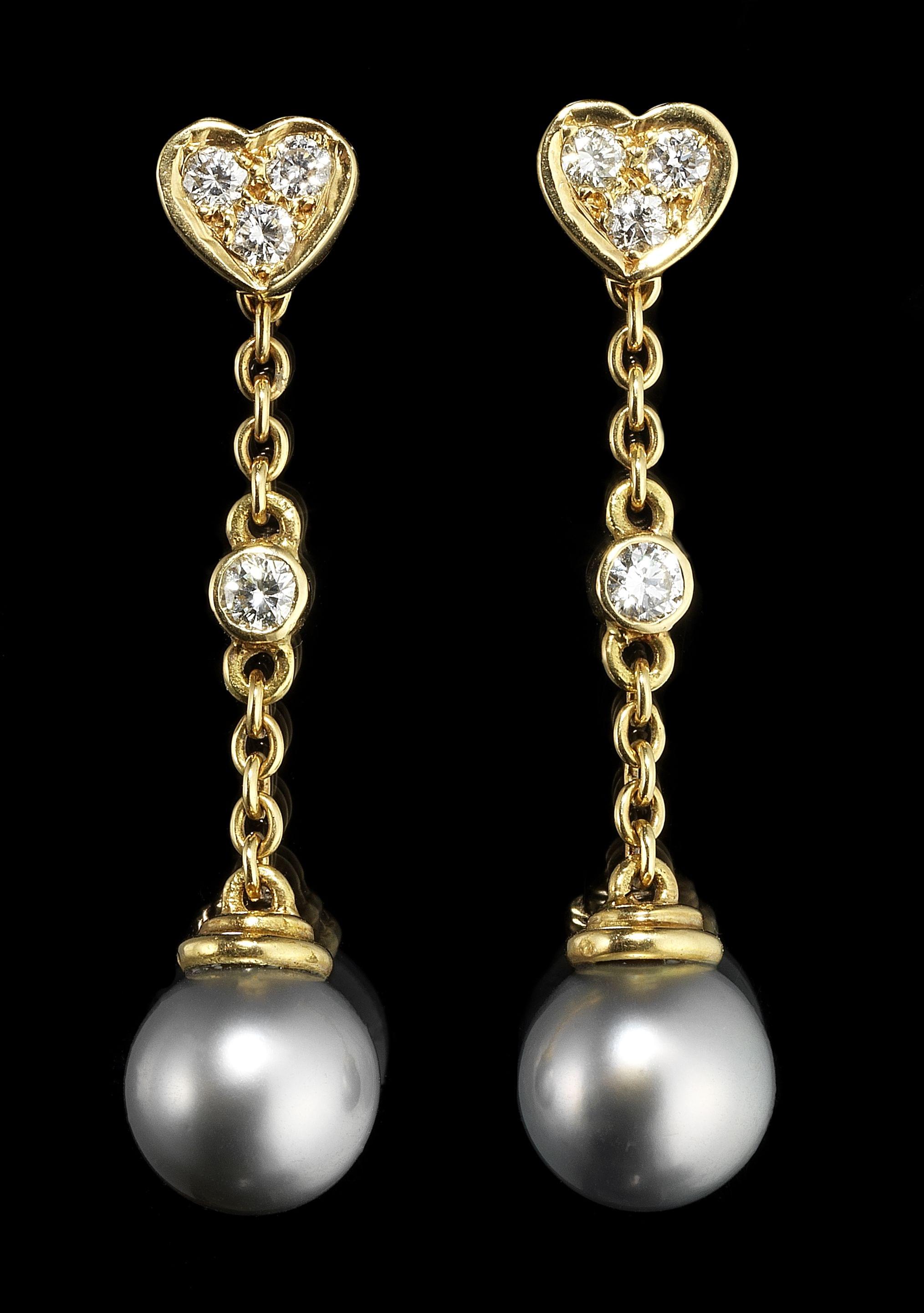 Composés de clous à motif de cœur sertis de diamants et retenant chacun un pendant amovible serti d'un diamant et terminé par une perle de Tahiti (D env. 9 mm), or 750, H 4 cm, poids brut 6 g