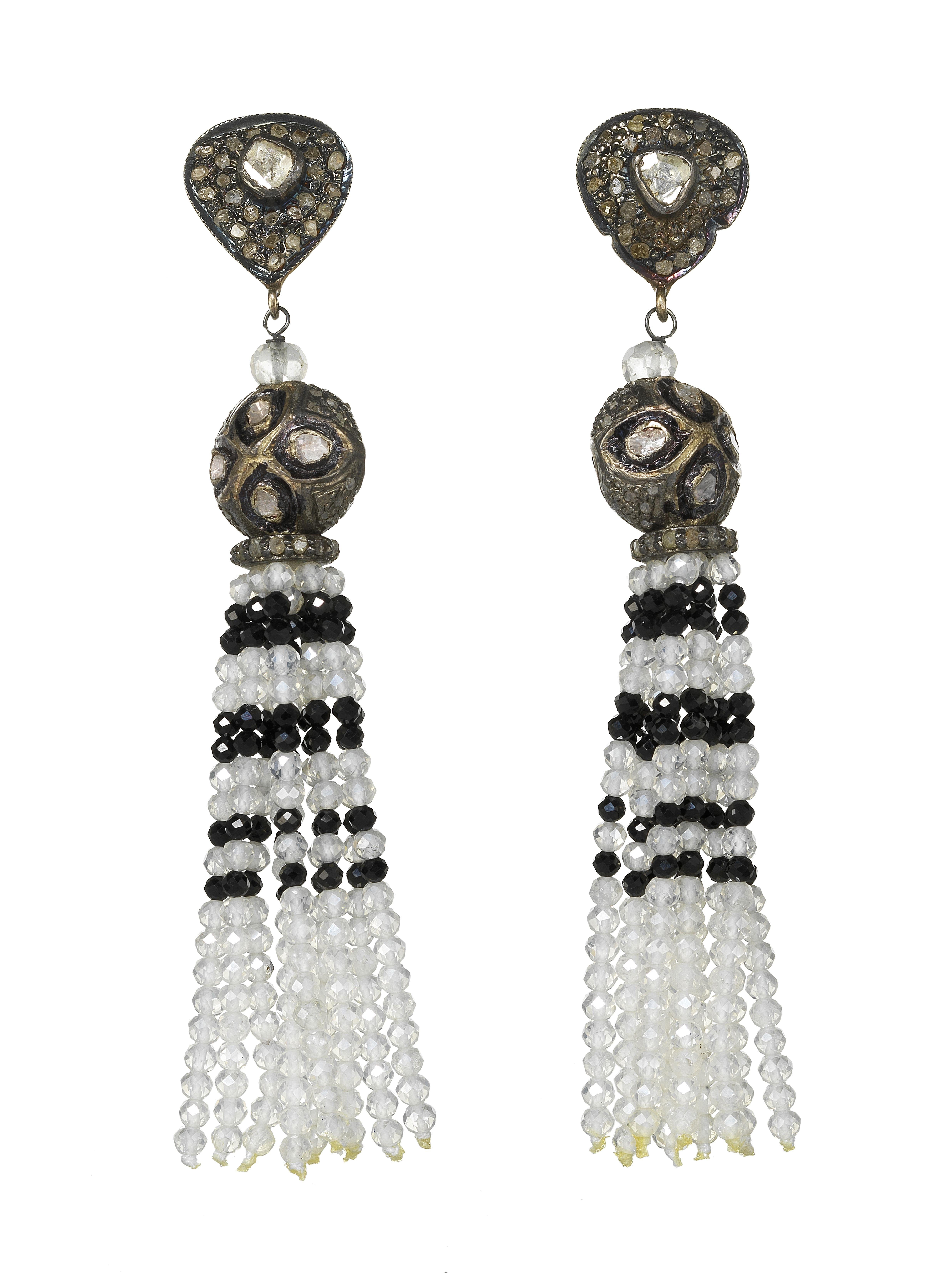 Composés de perles de topazes blanches et de spinelle noir, rehaussés de motifs pavés de roses de diamant, argent noirci 925, H 7 cm. Pour les lots précédés d'un *, la TVA de 7,7% est due sur l'entier du prix d'adjudication.