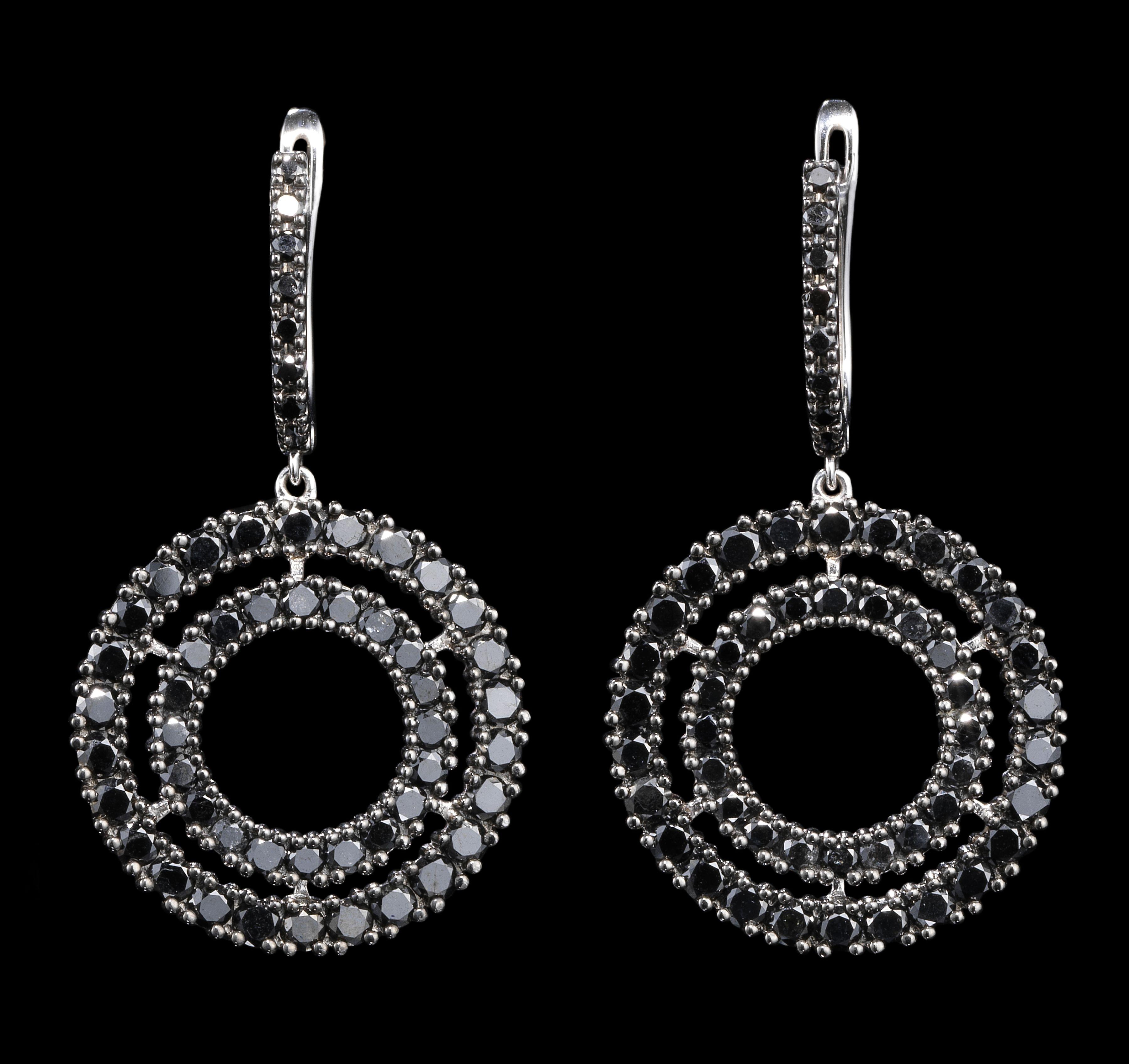 3398. Pendants d'oreilles à motifs circulaires ajourés pavés de diamants noirs (env. 4 ct)