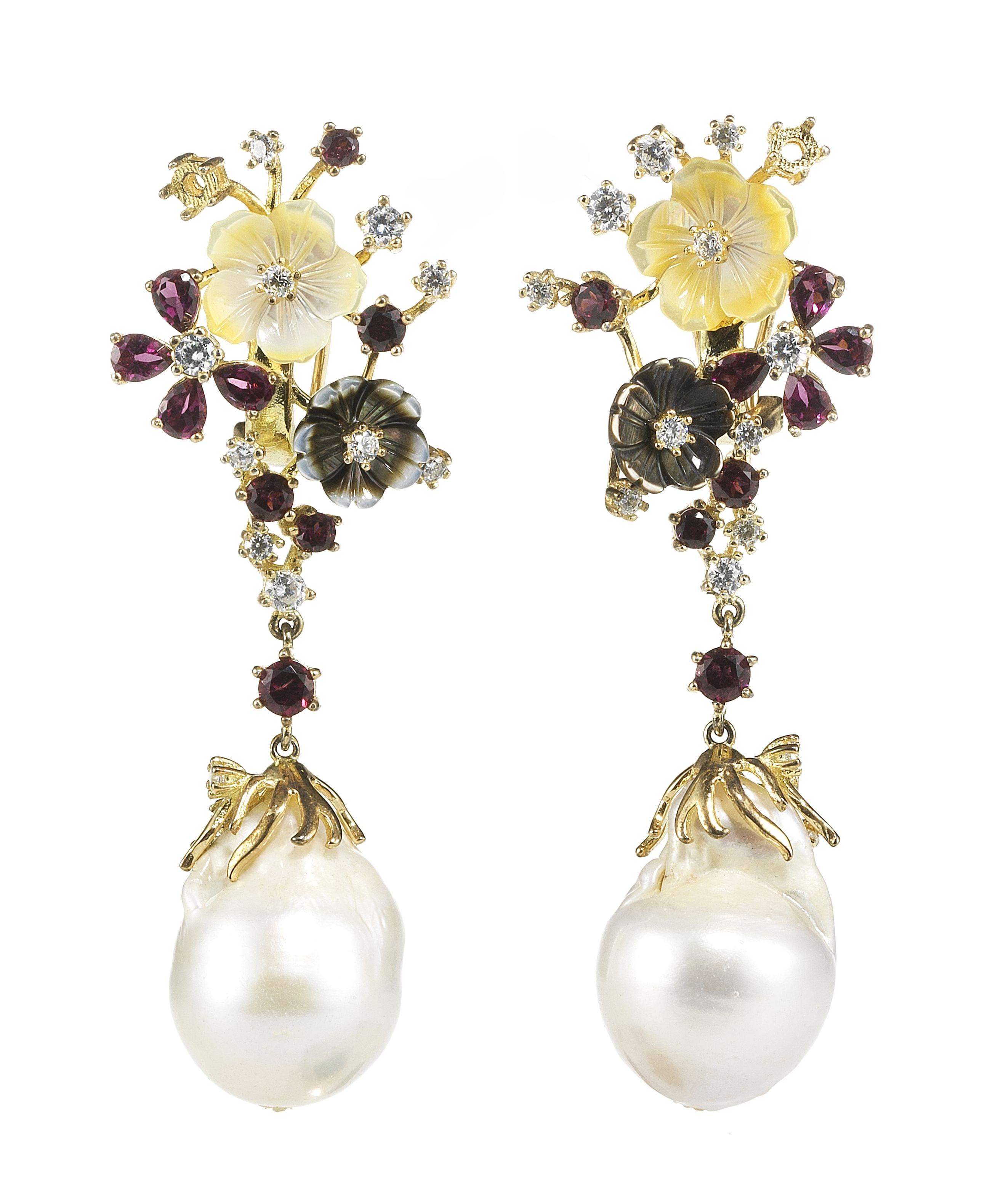 Retenant chacun une perle baroque (D env. 14 mm) et ornés de deux fleurs en nacre blanche et grise, rehaussées de diamants et de rhodolites, vermeil 925, H 5 cm. Pour les lots précédés d'un *, la TVA de 7,7% est due sur l'entier du prix d'adjudication.