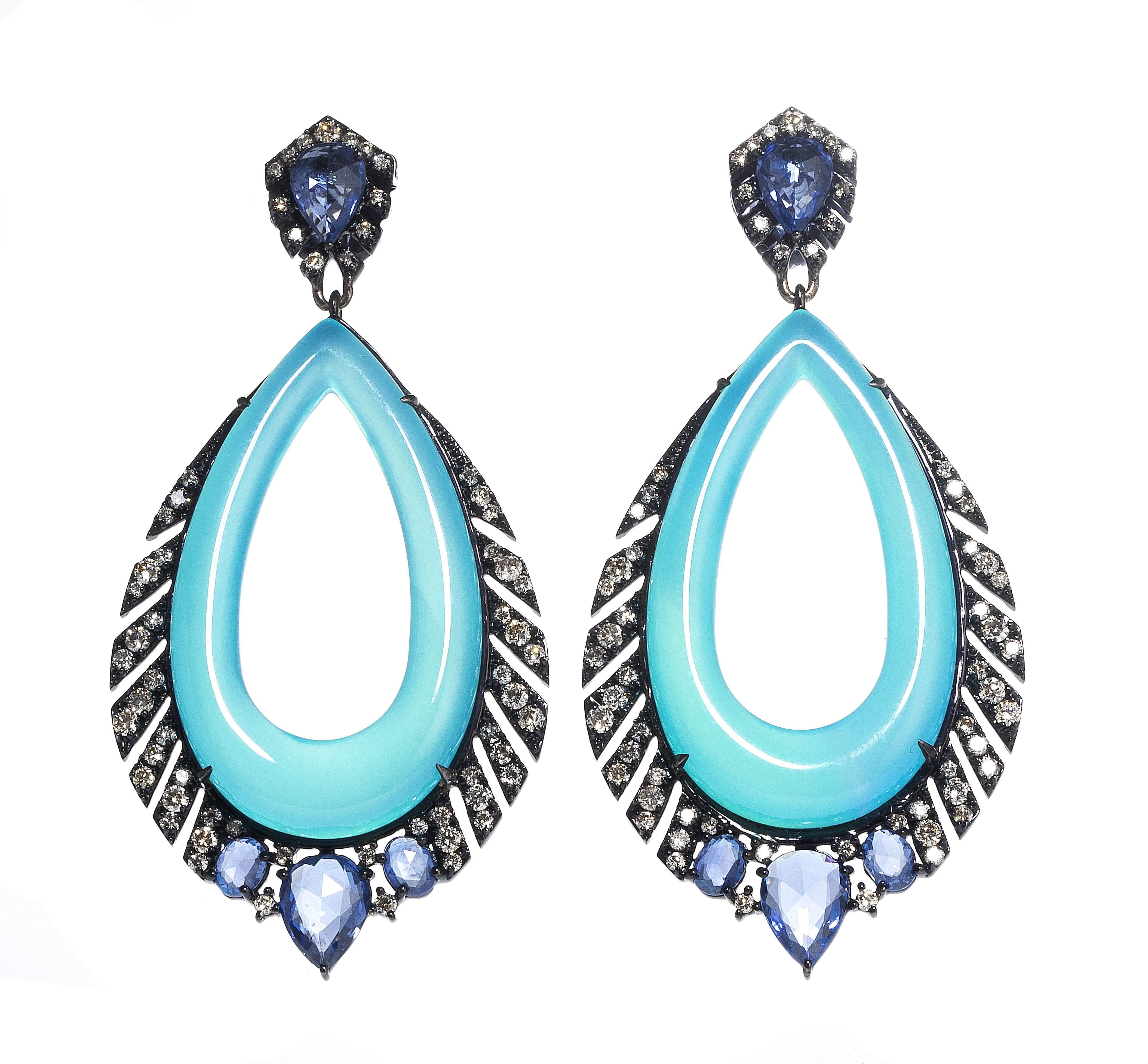 3325. Pendants d'oreilles composés de topazes bleues polies rehaussées de diamants champagne et de saphirs taille ovale et poire facettés