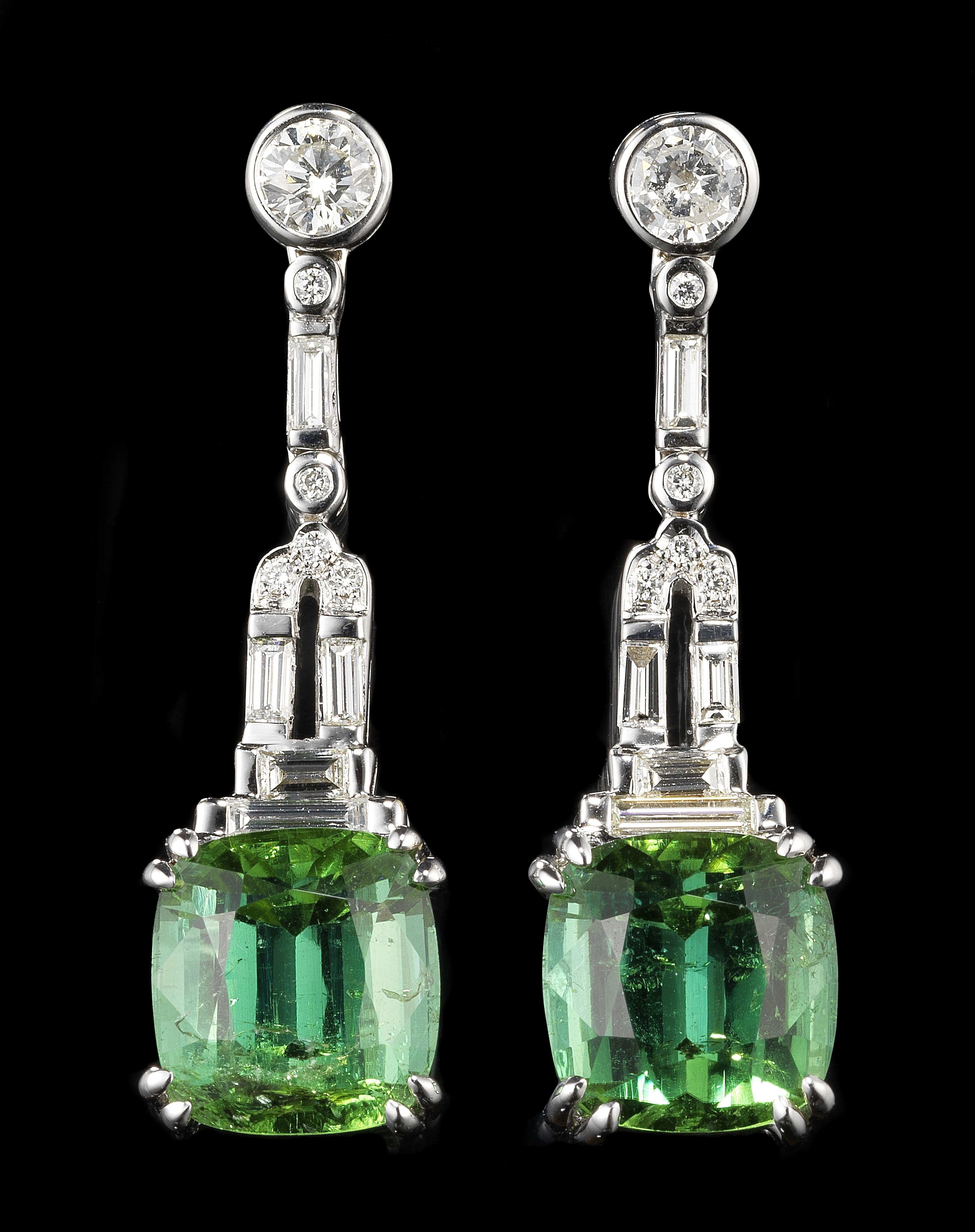63. *Pendants d'oreilles de style Art déco retenant chacun une tourmaline vert-bleu taille coussin (total 11,65 ct) rehaussée d'une ligne de