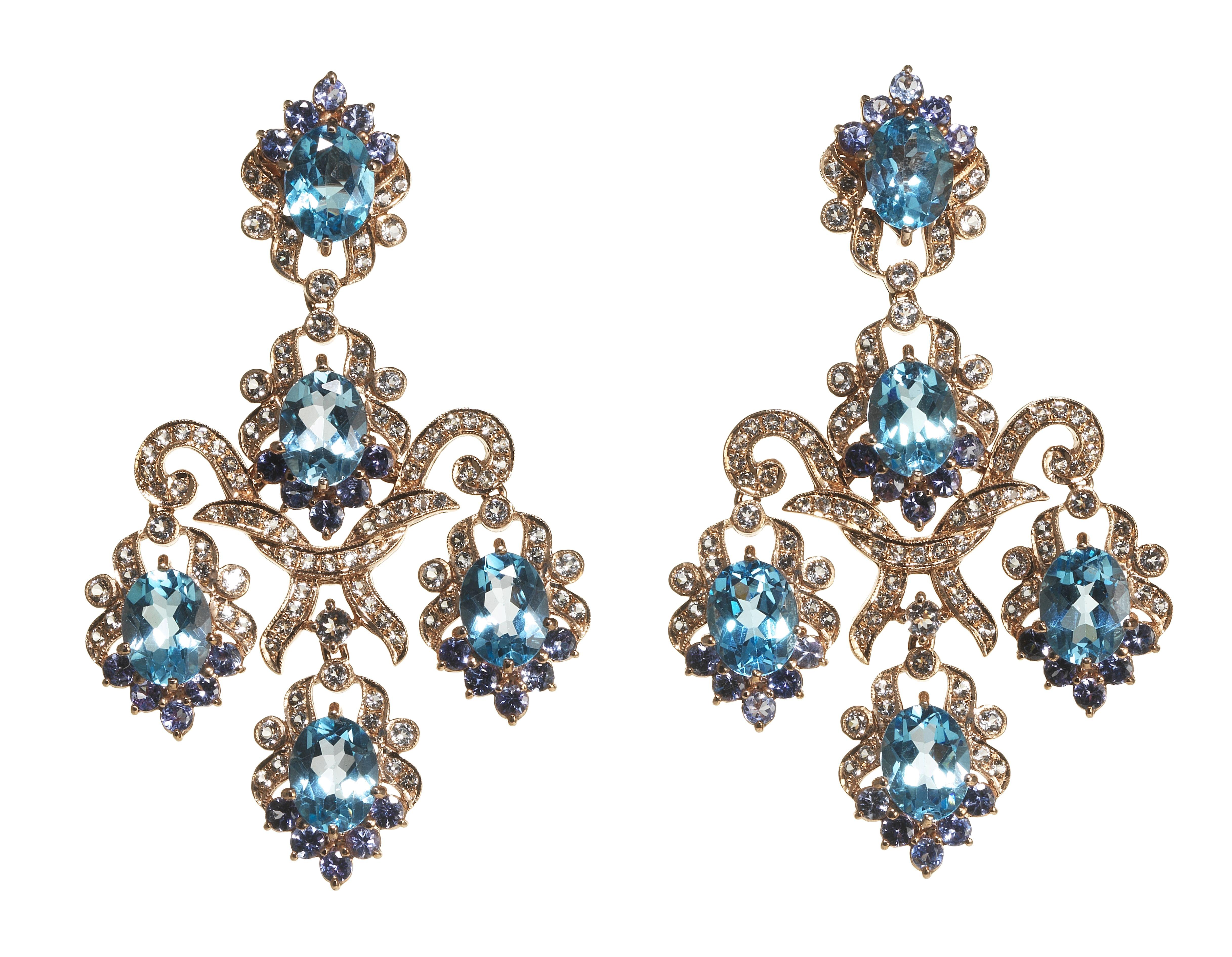 3237. *Pendants d'oreilles girandoles pavés de topazes bleues taille ovale rehaussées de tanzanites et topazes blanches