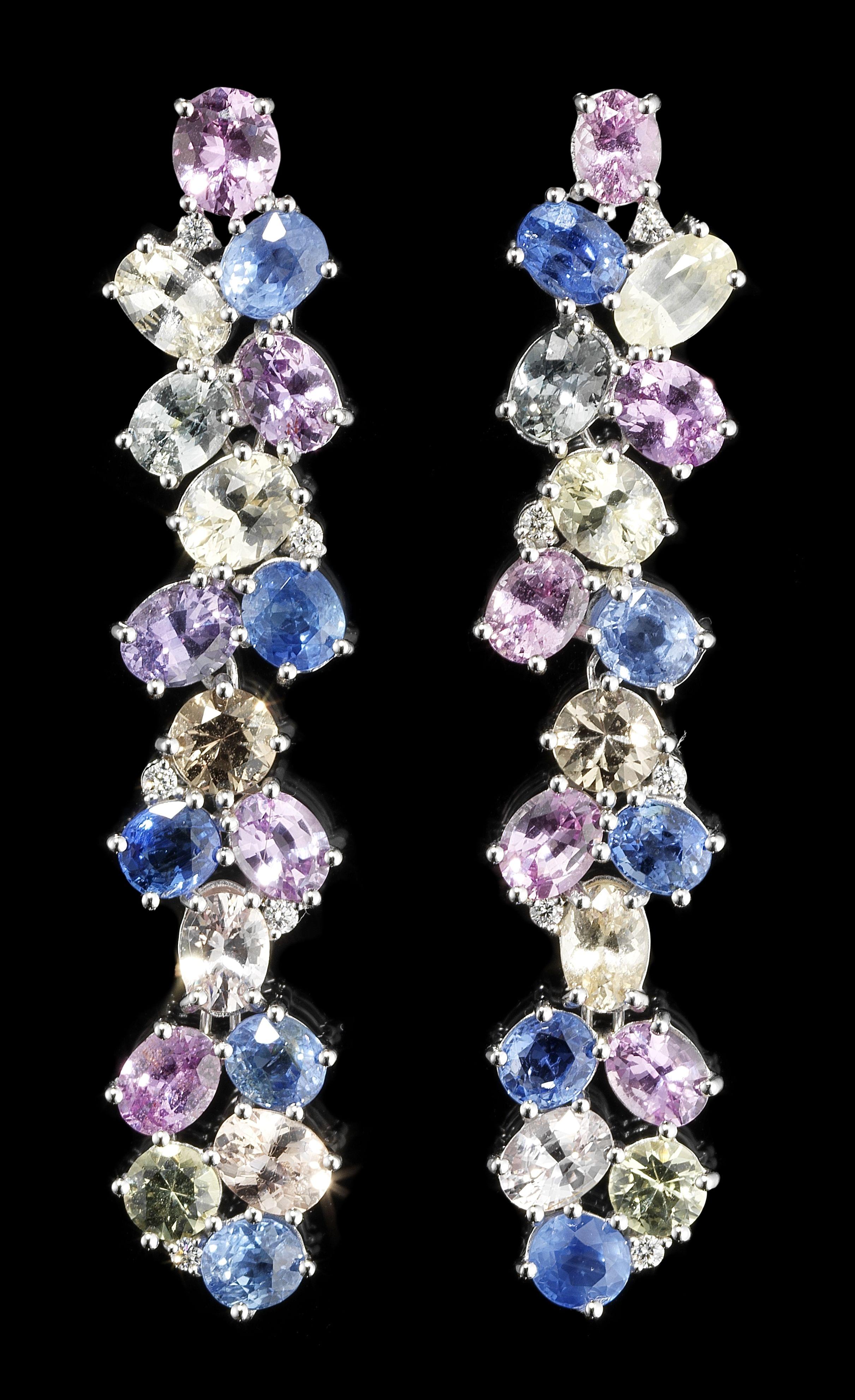 64. Pendants d'oreilles longs sertis de saphirs de couleurs bleus, rose, verts et jaunes, ponctués de petits diamants